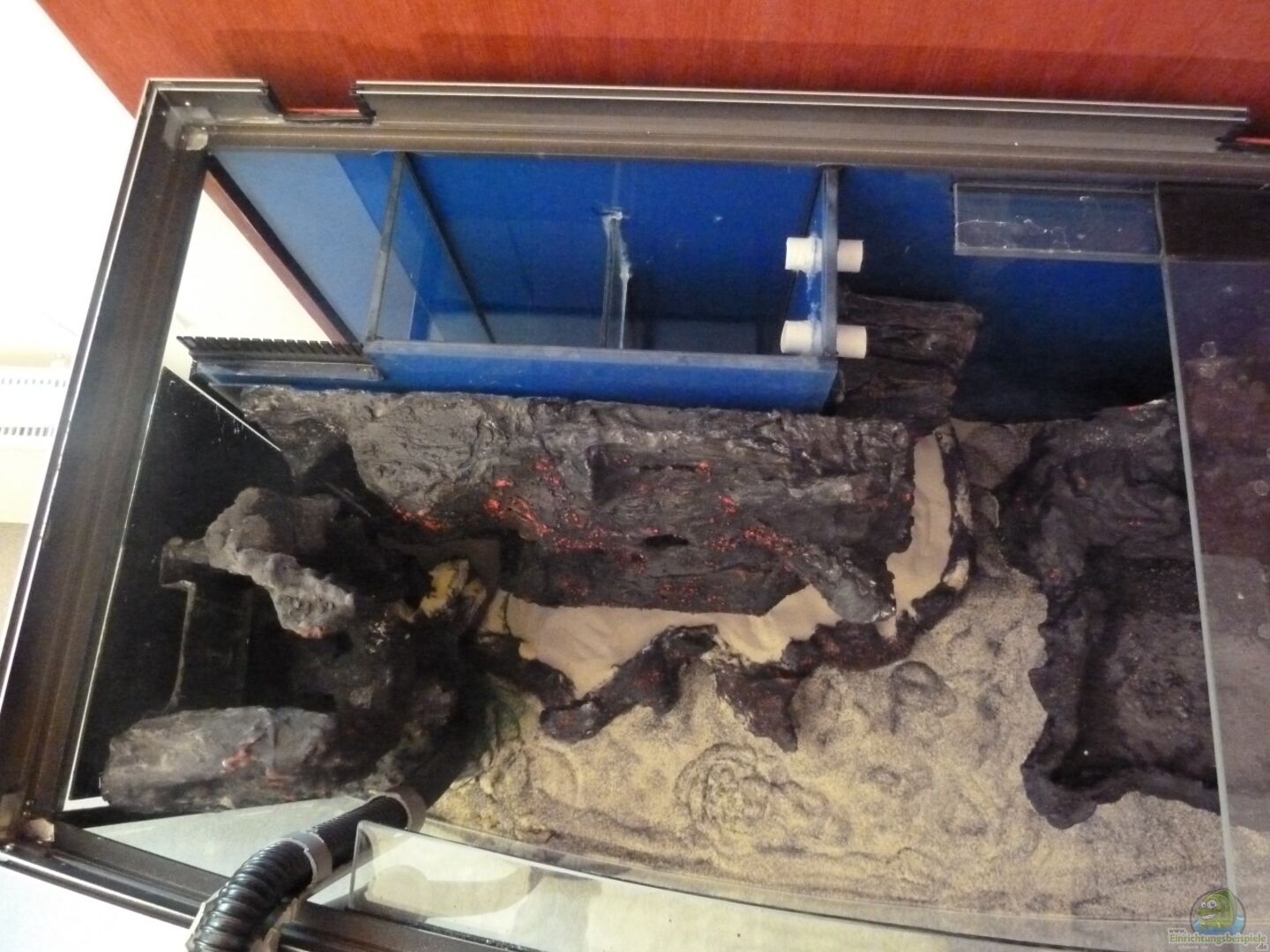 Rückwand: 61 kg Felsdeco selbst gebaut mit glühendem Messer aus Styropor, mit Fliesenkleber oder Zement ( ca. 1, 5cm stark) bestrichen, 2 Tage nach Abbinden mittels Gasbrenner ausgebrannt. 4 Wochen im Gartenpool gewässert und anschlie??end getrocknet, mit Epoxydharz ( Bredderman) gestrichen, mit schwarzem Colorkies und Sand abgestreut ( gibt etwas Struktur) und extra noch mit Acrylfarbe bepinselt. Die Rückwand und die Terrassenfelsen [...]