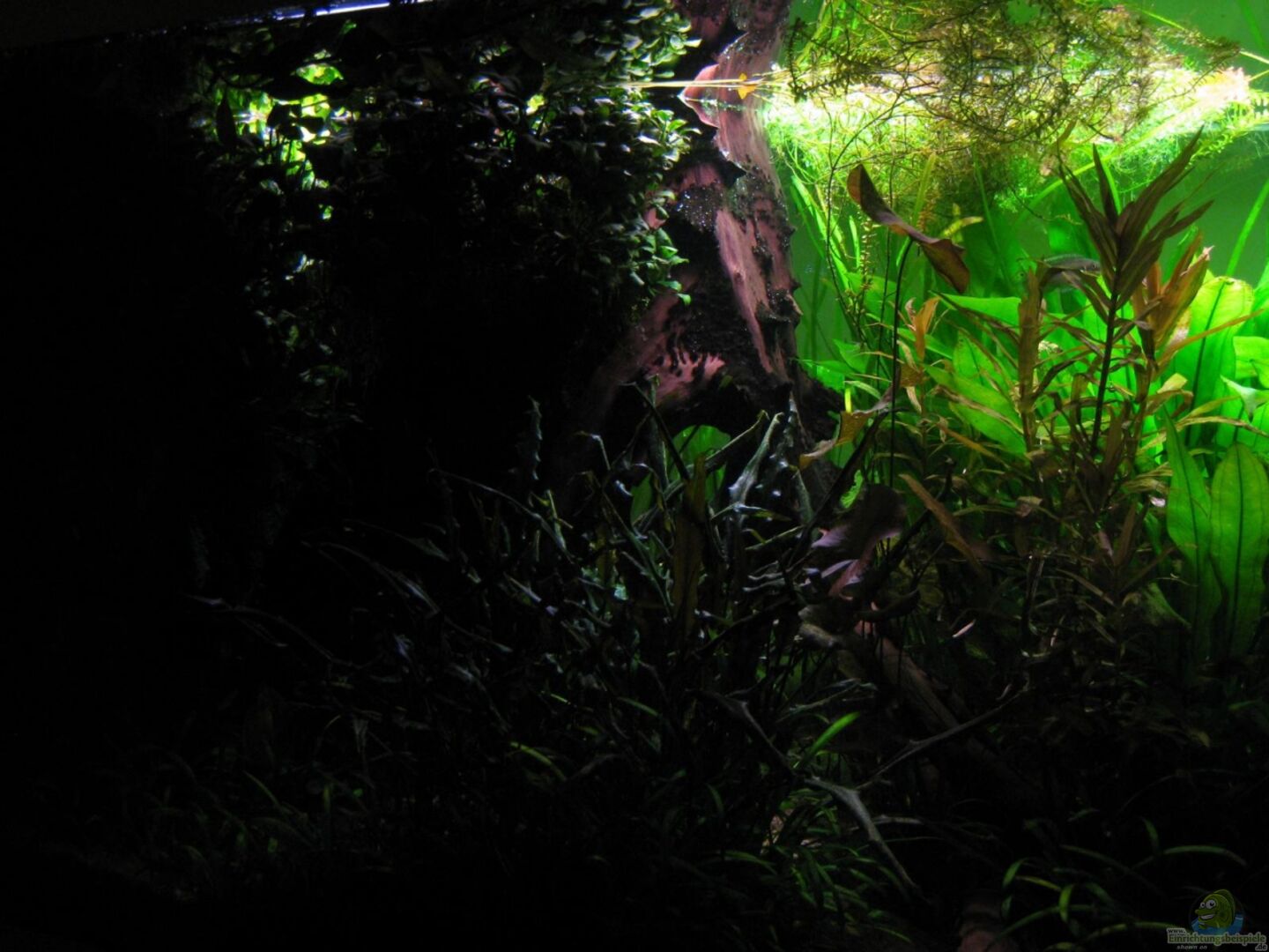 Glasdicke 12mm. Das Becken hat keine Bohrungen, sondern links vom Becken sind 10% (20cm, ca.100 Liter) für einen gro??en Biofilter abgetrennt, so dass das Wasser nur innerhalb des Beckens von links nach rechts gepumpt wird. Das Becken stammt inkl. Abdeckung und Leuchtbalken von Klaus Ruffert und seinem Team "Diamantaquarien".