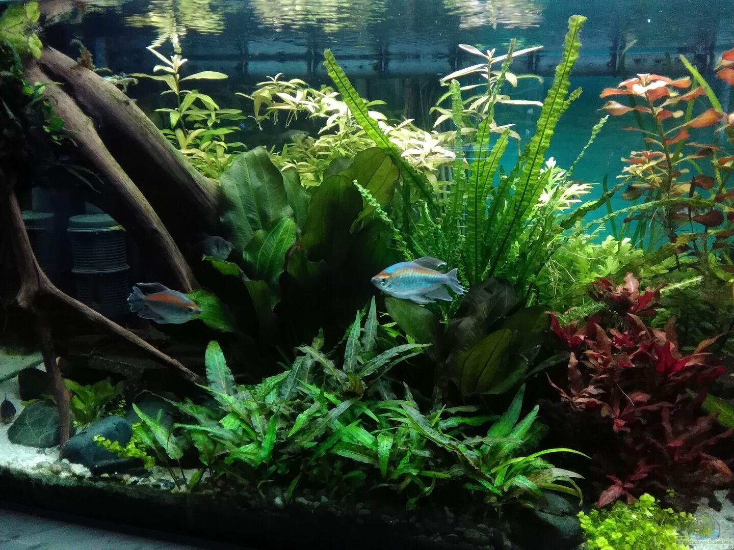 Juwel-Becken, 8 mm Float-Glas, Bodenscheibe 10 cmm Verkleidet von uns mit L-Aluschienen zur besseren Optik auf selbst gezimmertem Tisch, Filter stehen rechts und links