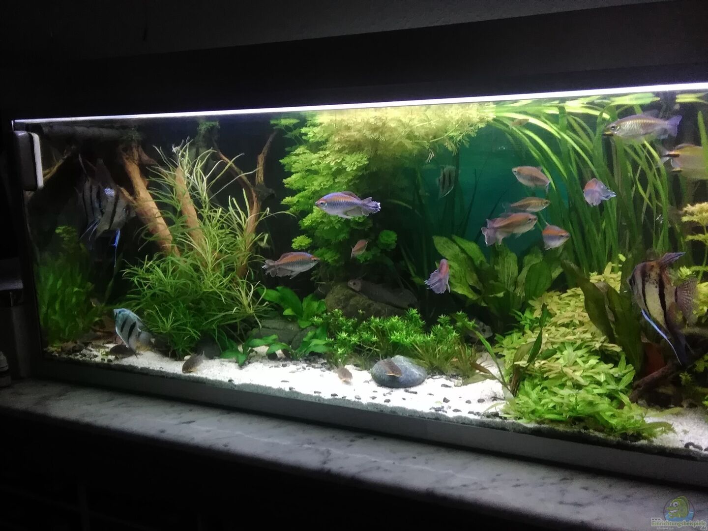 Juwel-Becken, 8 mm Float-Glas, Bodenscheibe 10 cmm Verkleidet von uns mit L-Aluschienen zur besseren Optik auf selbst gezimmertem Tisch, Filter stehen rechts und links