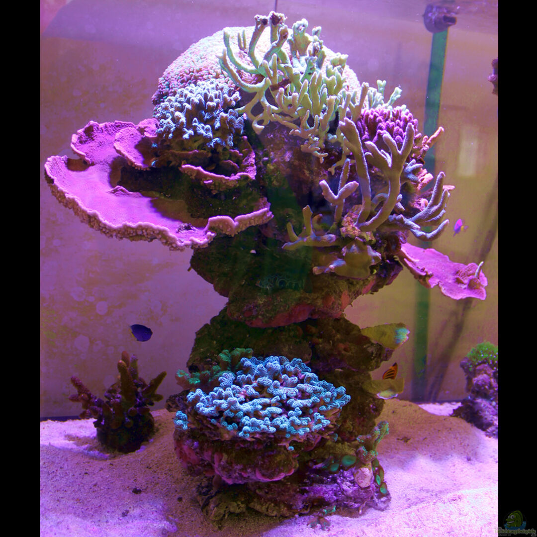 Das Becken hat zwei Riffsäulen und einen kleinen mittleren Steinaufbau, auf einen massiven Riffaufbau wurde bewusst verzichtet. Der Vorteil liegt in der deutlich besseren Umströmung der Korallen und den Abwechslungsreicheren Umfeld für die Tiere. Die Riffsäulen sind gebohrt und mit einem PVC-U Rohr gesichert.