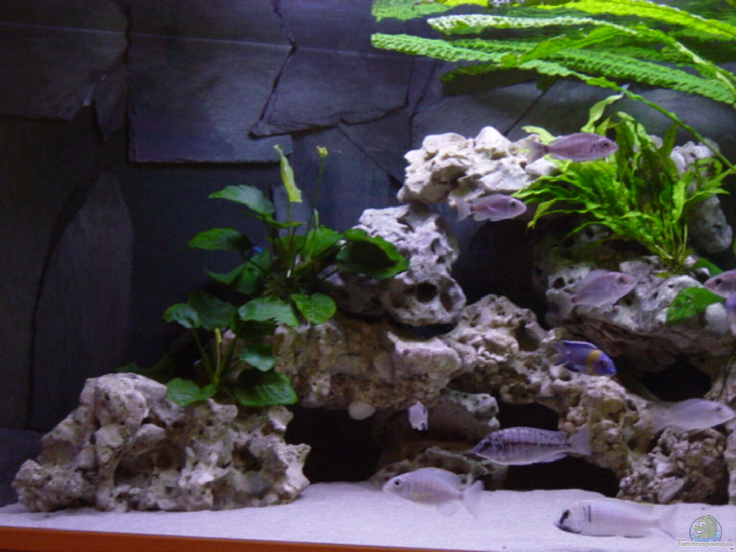 Circa 60 Kg helles Lochgestein das mit Styropor unterlegt wurde. In einer Hälfte des Beckens zu vielen Höhlen und Durchgängen aufgebaut, um ausreichend Rückzugsmöglichkeiten zu schaffen. In der anderen Hälfte ein einzelner Stein zur Auflockerung der Sandfläche. Da dies kein Mbunabecken ist wurden nur relativ wenig Steine eingebracht um den Fischen viel freien Schwimmraum und ausreichend Sandfläche zu bieten.Die Rückwand wurde mit dunkelgrauen, fast schwarzen Schieferplatten beklebt, [...]