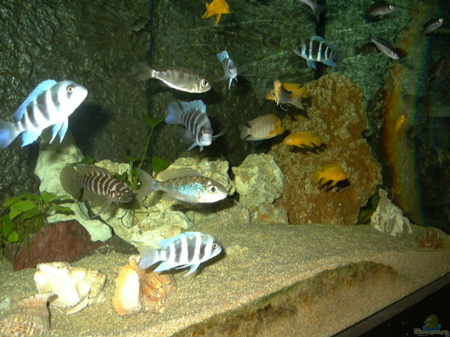 Als Rückwand habe ich Rückwand Module von Juwel eingeklebt. Steinaufbauten befinden sich an den beiden Enden des Aquariums, um in der Mitte viel freien Schwimmraum zur Verfügung zu stellen. Auf dem Boden in der Mitte sind verschiedene gro??e Schneckenhäuser verteilt.