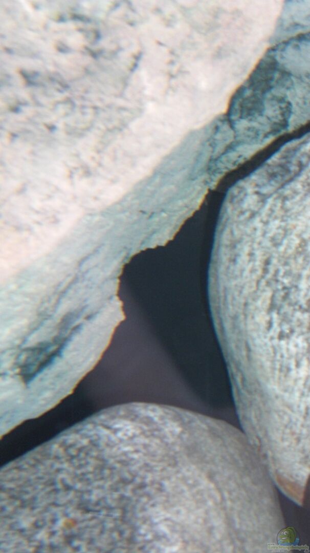 200 kg Findlinge . Die Steine stehen auf einer 2 cm dicken Styroporplatte. Schawrze Rückwandfolie. BTN Modul ( es wurde ein loch gebohrt so dass die fische durch schwimmen können)