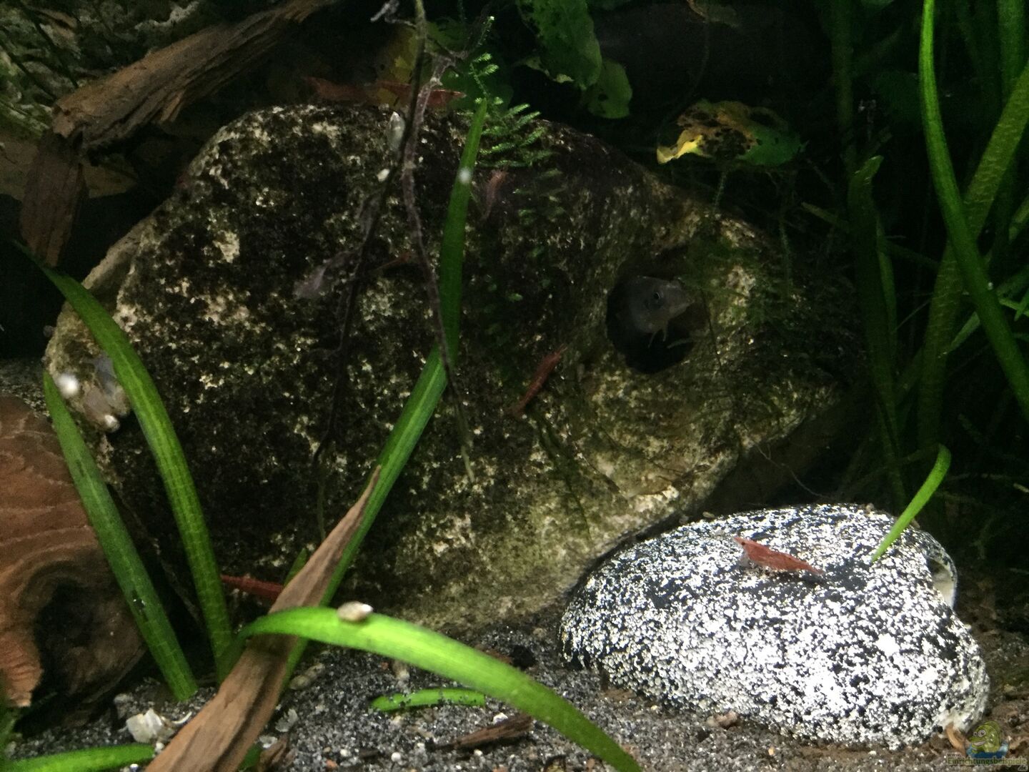 Die Einrichtung besteht aus 4 Stücken Lochgestein, welches das Wasser allerdings nicht (mehr) aufhärtet. Zudem befindet sich noch zwei Keramikhöhlen sowie mehrere Moorkienwurzeln in dem Aquarium. Zwischen den Wurzeln und Steinen bestehen zahlreiche Zwischenräume und Rückzugsplätze für die Bewohner. Die Moorkienwurzeln sind zudem eine wichtige Nahrungsergänzung für die kleinen Rotpunktantennenwelse. Au??erdem befinden sich noch Seemandelbaumblätter, Buchen-/Eichenlaub und Erlenzapfen [...]