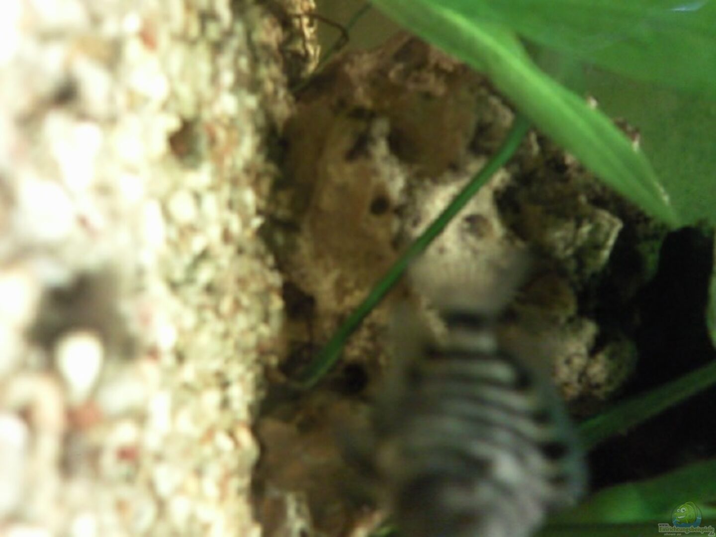 Ein kleinerer Lochstein, eine Moorkienwurzel, eine selbst hergestellte Höhle, kommt die Tage rein, zwei Muscheln, kleiner Steinaufbau im linken Vordergrund, mehrere kleine Steine im Becken verteilt,