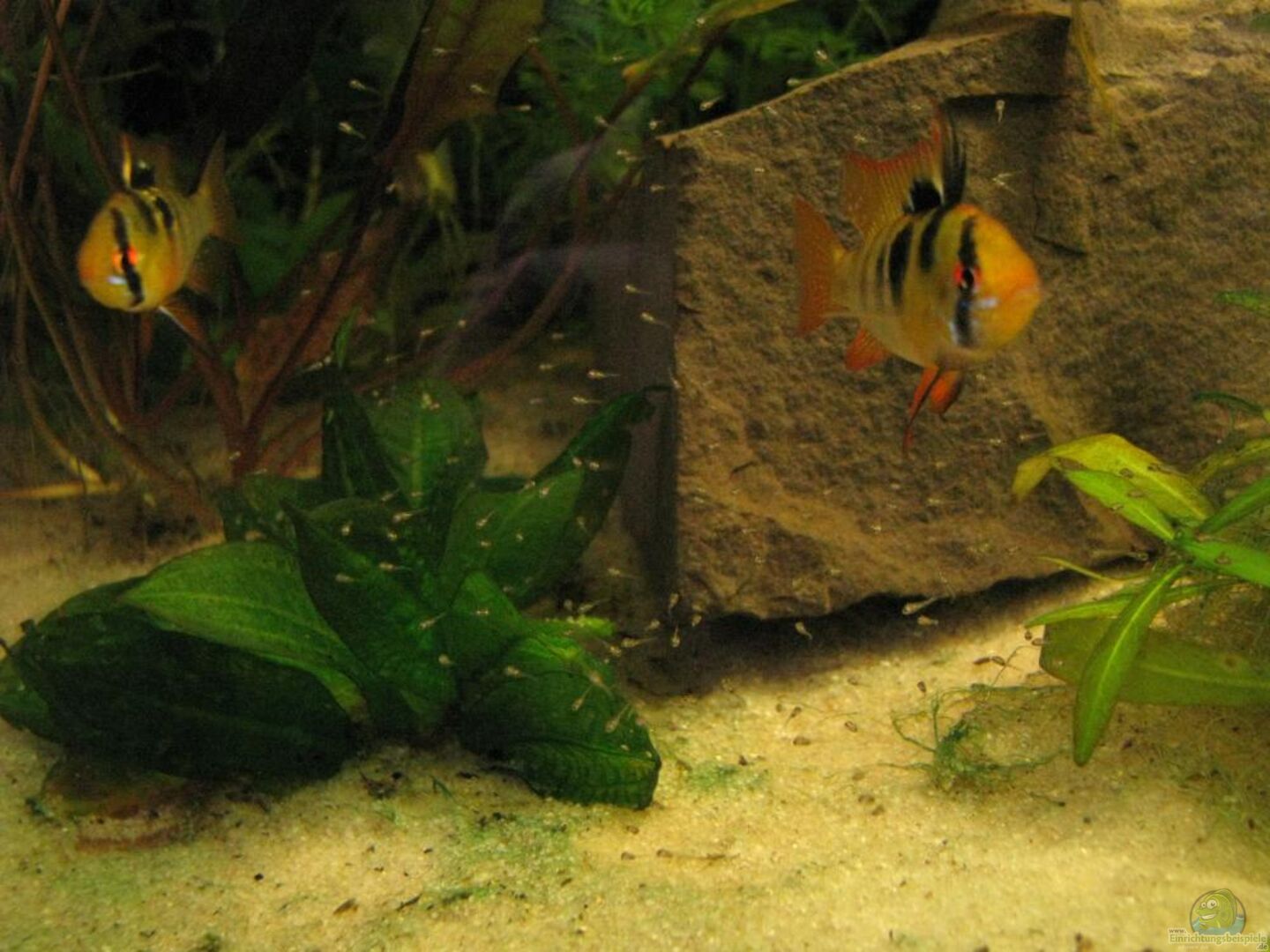 65 Schmucksalmler, 3 Pärchen M. ramirezi aus eigener Nachzucht, 1 Pärchen Apistogramma cacatuoides (ebenfalls selbst gezogen), 1 Pärchen Antennenwelse, 1 Rüsselbarbe, 4 Ohrgitter-Welse und einige Amano-Garnelen. Dazu kommen demnächst noch 12 Prachtschmelen, die z.Zt. noch im 300er unterwegs sind und die für dieses Becken langsam zu gro?? werden. Am 18.03.2010 habe ich hier über Einrichtungsbeispiele.de von Patricia eine ca. 9 Jahre alte Prachtschmerle übernommen - danke noch mal dafür. [...]