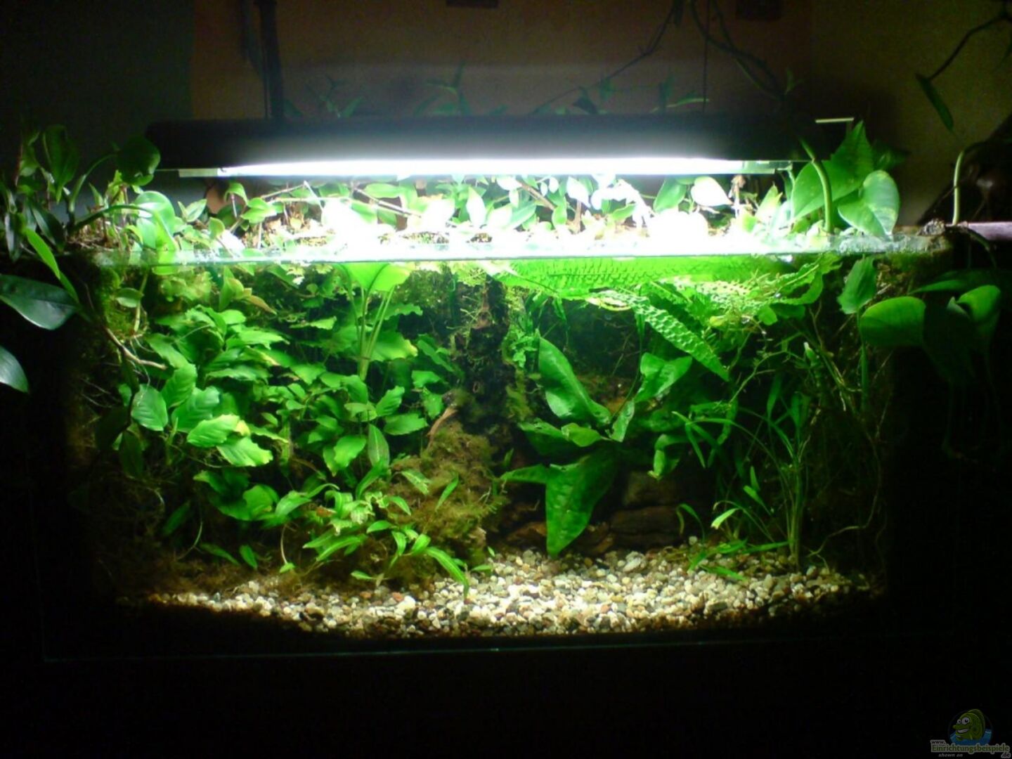 Das Becken ist offen und steht auf einem selbst gebauten Unterschrank. Bis August 2007 war das Aquarium mit einer Scheibe abgedeckt, hatte eine 15W Leuchtstofflampe, bekam kein CO2 eingeleitet und wurde, au??er über das Futter, nicht gedüngt. Ging auch, war aber nicht so schön.