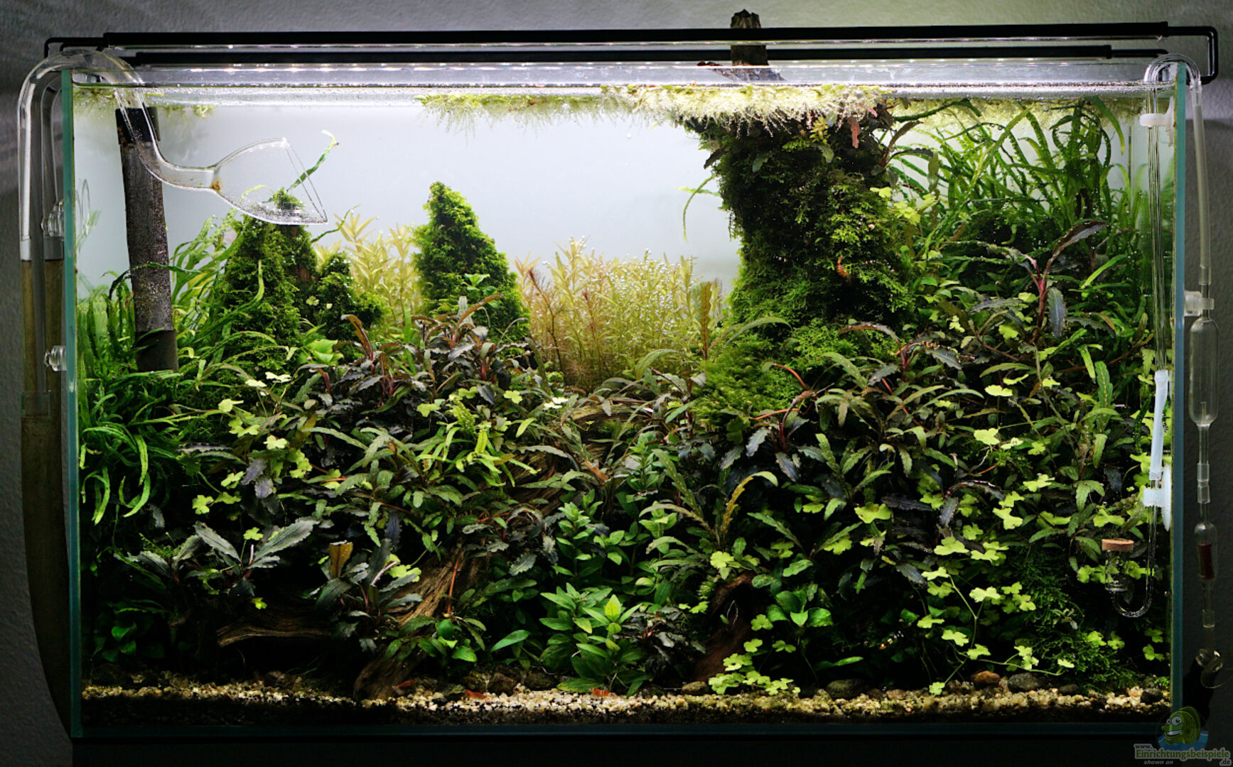 Es handelt sich um ein transparent verklebtes Glasgarten-Aquarium aus einfachem Floatglas, welches ich schon seit einigen Jahren habe. Neu ist der Unterschrank im ADA-Stil, den ich aus 19 mm MDF Platten gebaut habe.