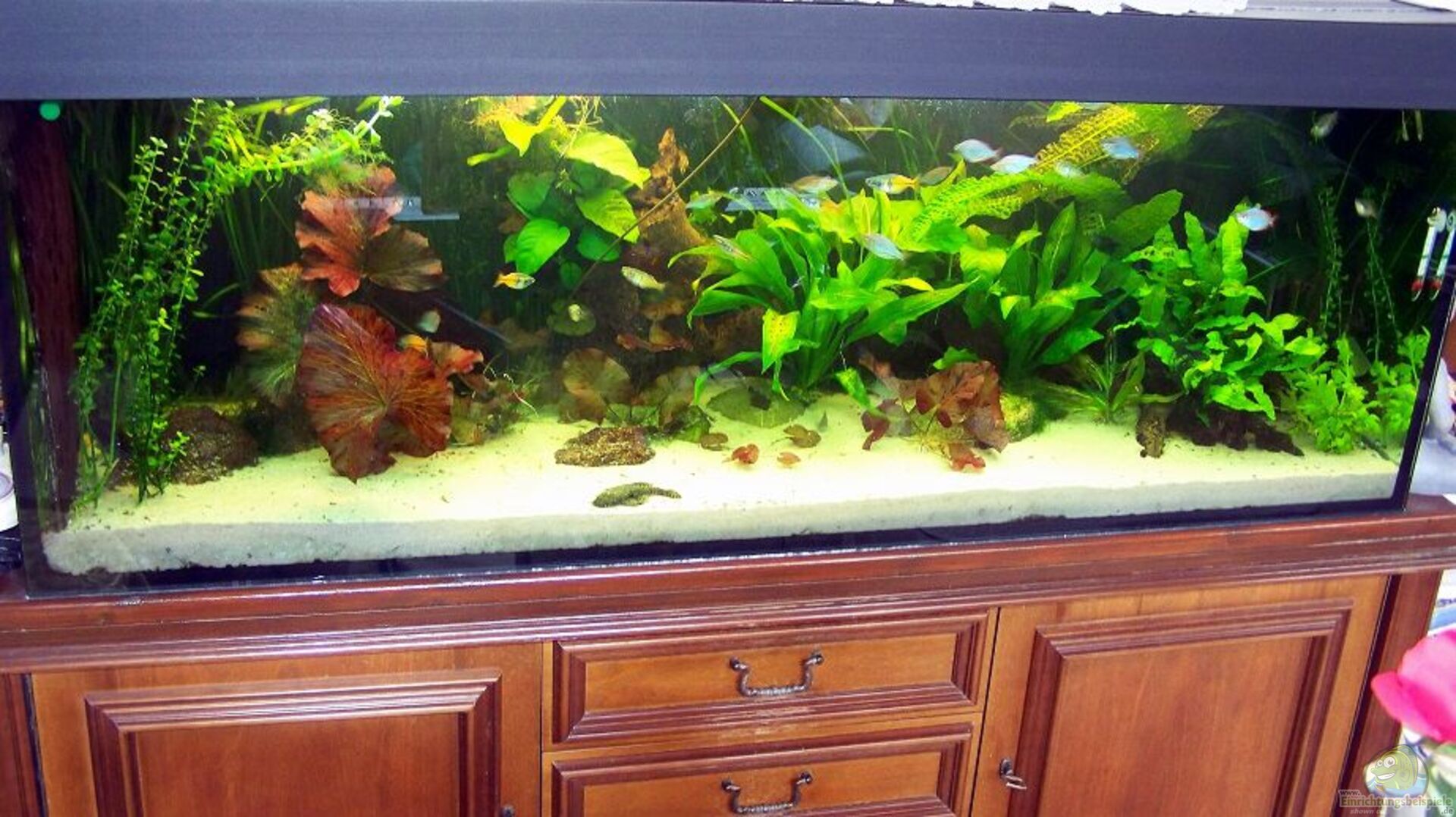 * Klassisches Rechteckaquarium mit stabilisierter Anrichte aus Holz als Unterschrank. * Als Rückwand habe ich einfach schwarz-graues Krepppapier hinters Aquarium platziert und zwischen Glas und Papier ein paar künstliche Pflanzen geklemmt. Habe dadurch eine gute Tiefenwirkung erreicht. Die Valisnerien im Hintergrund passen gut dazu.