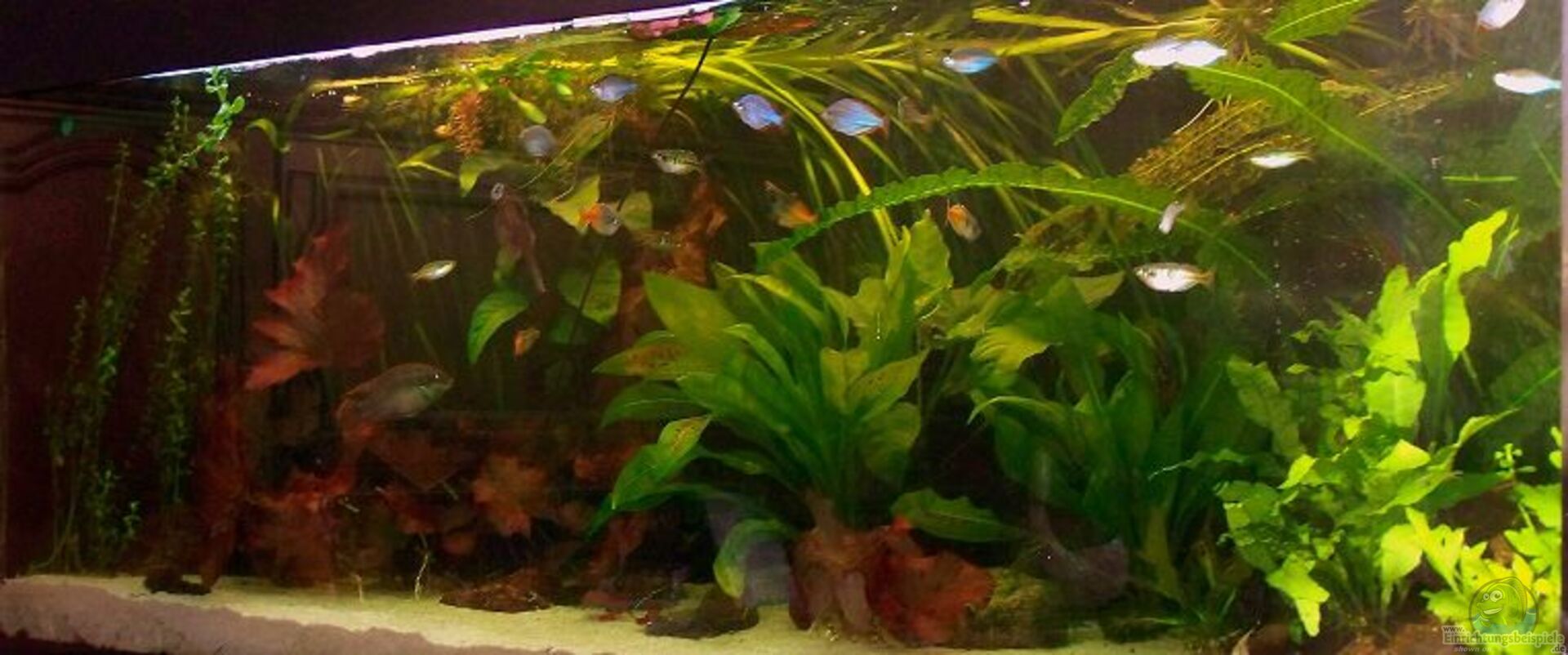 * Klassisches Rechteckaquarium mit stabilisierter Anrichte aus Holz als Unterschrank. * Als Rückwand habe ich einfach schwarz-graues Krepppapier hinters Aquarium platziert und zwischen Glas und Papier ein paar künstliche Pflanzen geklemmt. Habe dadurch eine gute Tiefenwirkung erreicht. Die Valisnerien im Hintergrund passen gut dazu.