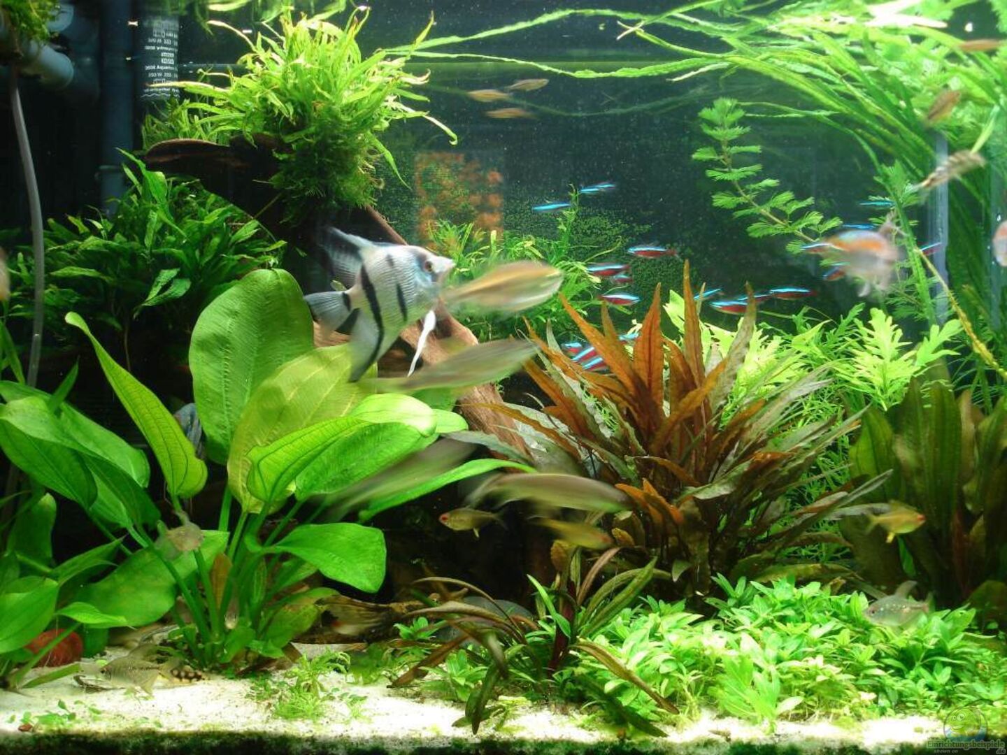 Juwel-Becken, 8 mm Float-Glas, Bodenscheibe 10 cmm Verkleidet von uns mit L-Aluschienen zur besseren Optik auf selbst gezimmertem Tisch, Filter stehen rechts und links