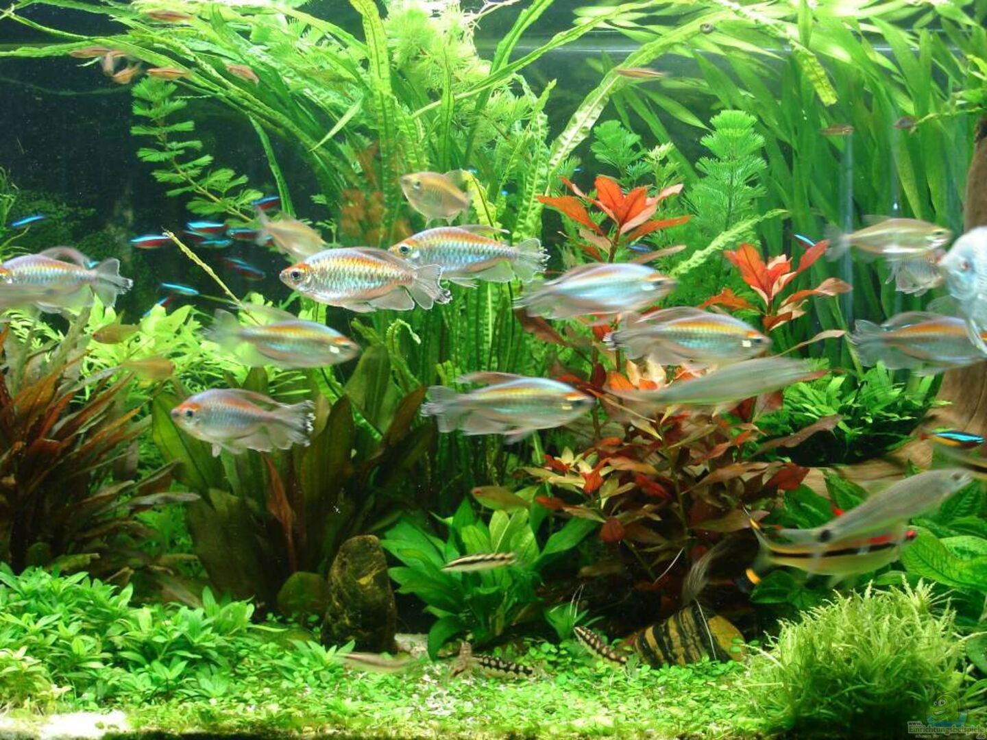 Juwel-Becken, 8 mm Float-Glas, Bodenscheibe 10 cmm Verkleidet von uns mit L-Aluschienen zur besseren Optik auf selbst gezimmertem Tisch, Filter stehen rechts und links