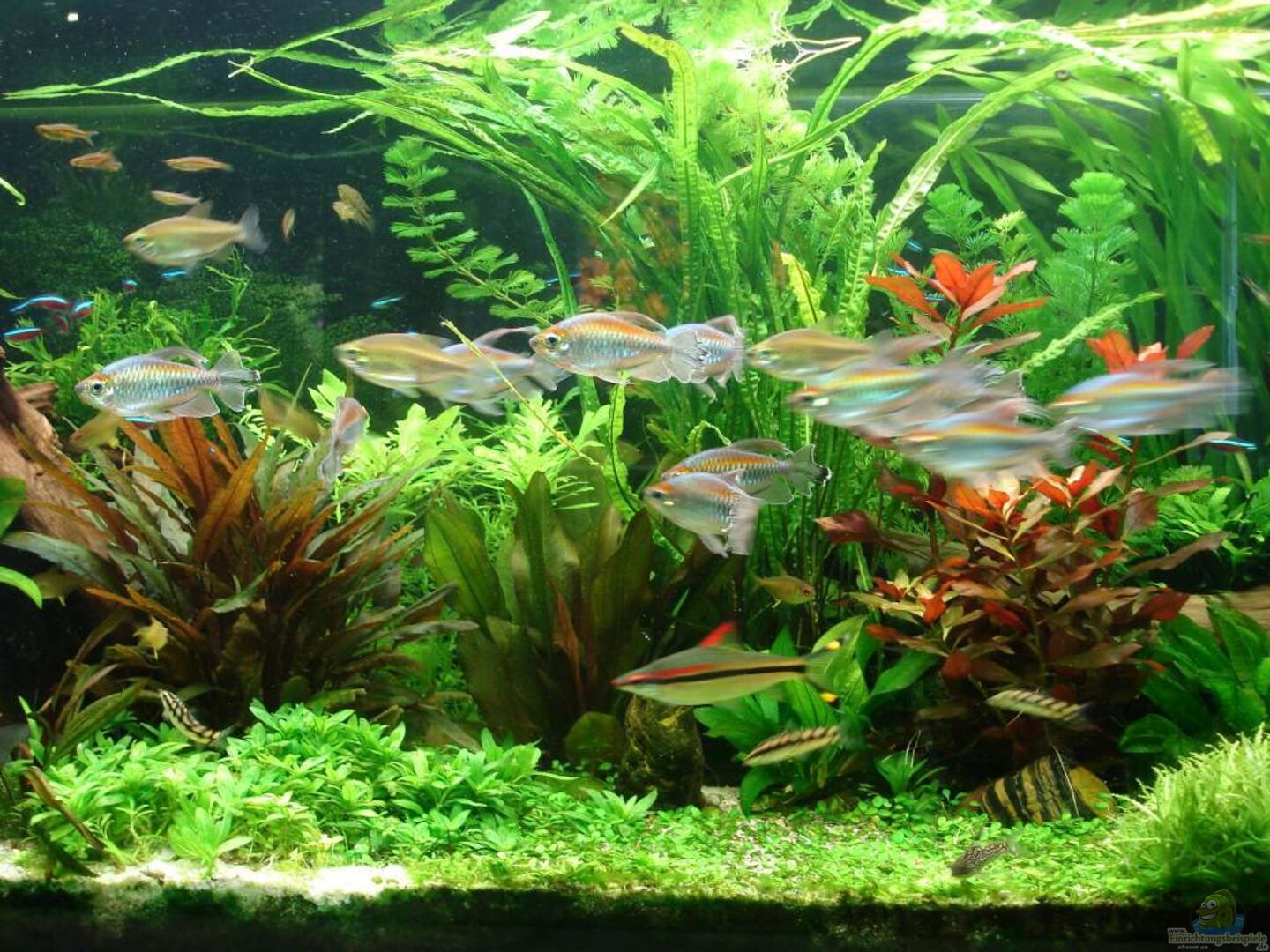 Juwel-Becken, 8 mm Float-Glas, Bodenscheibe 10 cmm Verkleidet von uns mit L-Aluschienen zur besseren Optik auf selbst gezimmertem Tisch, Filter stehen rechts und links