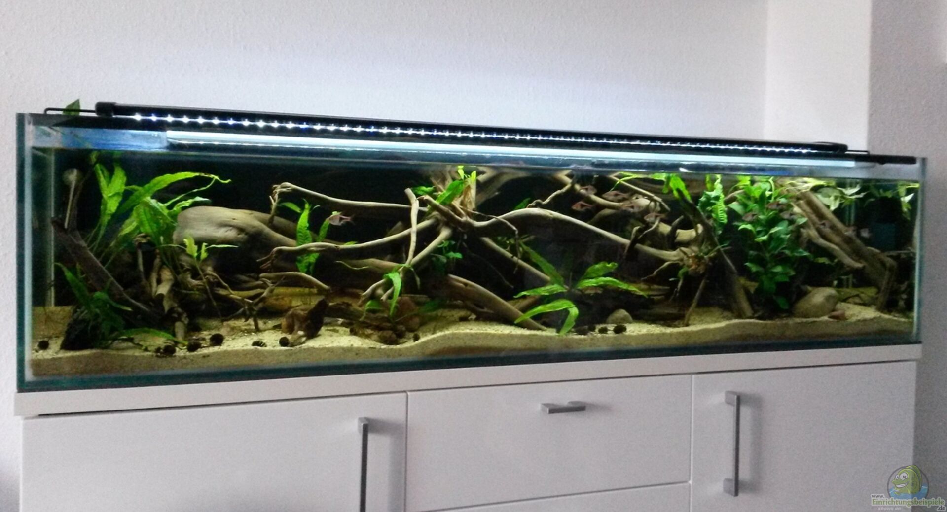 Wieder einmal handelt es sich bei dem Becken um eine Sonderanfertigung, die diesmal passend zum Sideboard gefertigt wurde. Hersteller ist die Firma Aquarienbau Voigt in Werneuchen bei Berlin. Das Becken wurde aus 8mm starkem Floatglas gefertigt und mit transparentem Silikon geklebt. Passgenau dazu habe ich mir eine dreiteilige Glasabdeckung von der Fa. Voigt anfertigen lassen, welche in zwei Kunststoff-E-Profilen auf der gesamten Beckenlänge verschiebbar ist. Als zusätzlichen Service wurden mir [...]