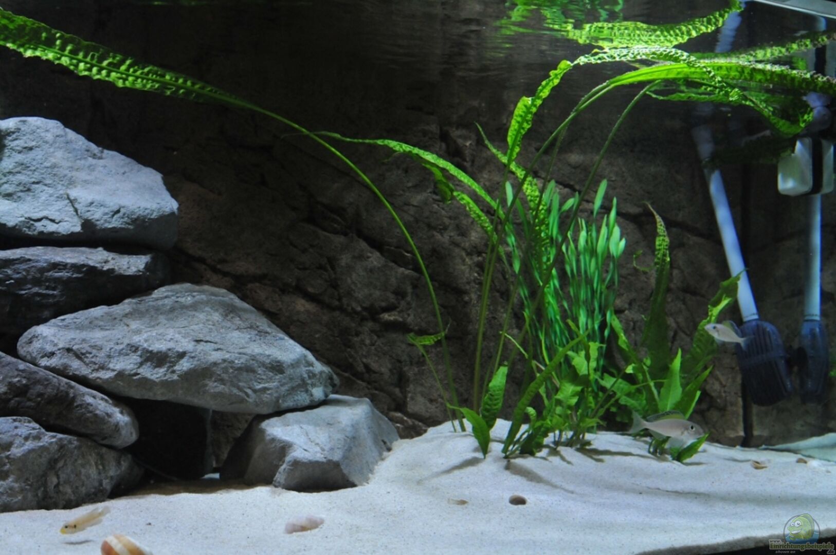 Vallisnerien gigantea in Kunstoff noch von den Malawiräubern übrig geblieben Weichen aber später echten Pflanzen. Siehe Fotos ab 23.1.11 2 Gro??e Cryptocoryne usteriana 3 Javafarns kommen sollen noch anubias in den steinen herum