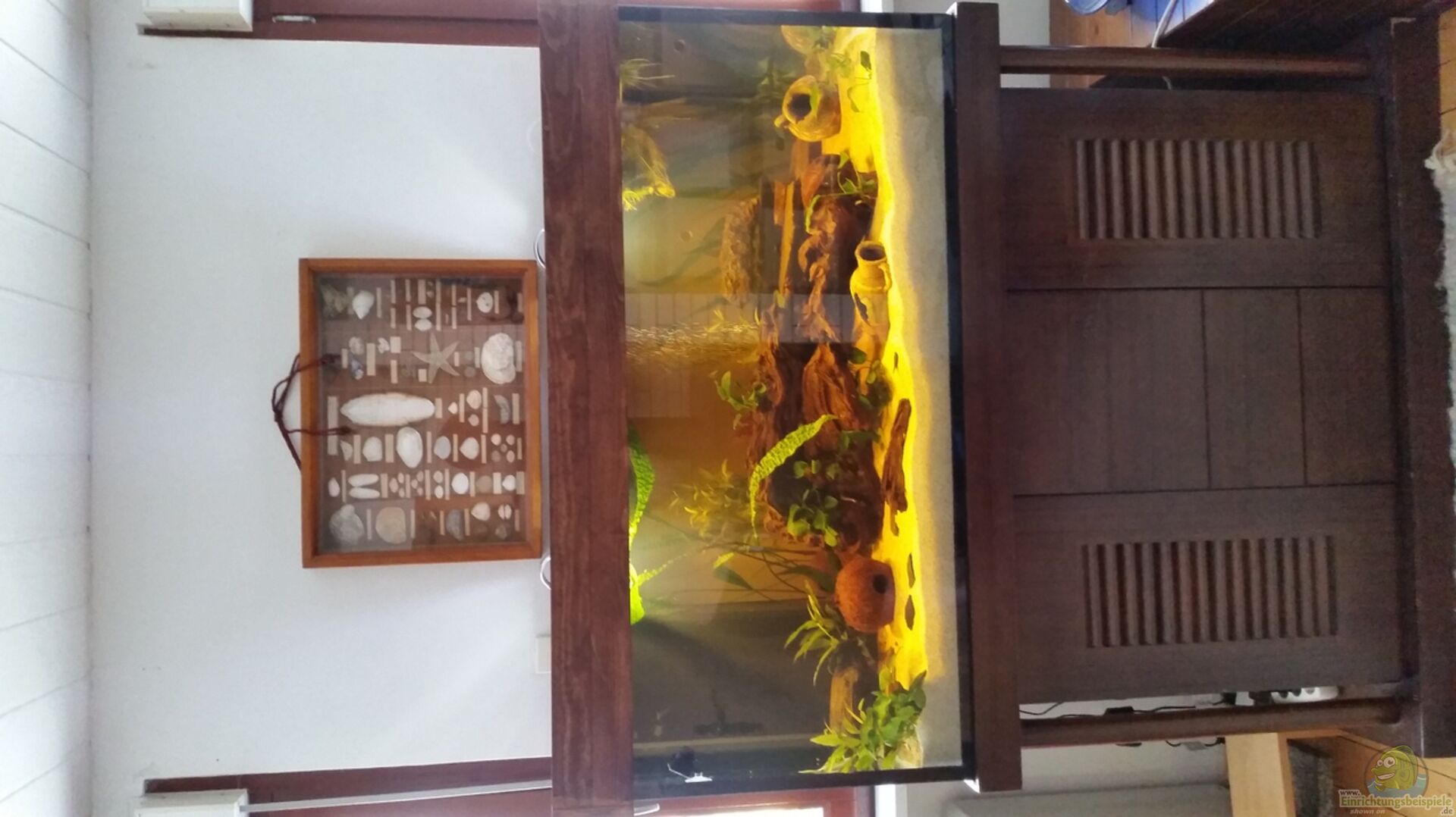 Ganz normales Aquarium. Aquarium kann durch 2 Plexiglasscheiben von oben eingesehen werden.