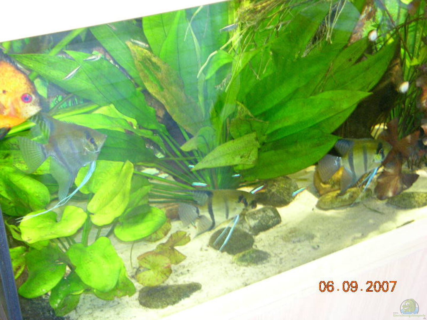 5x Skalare, Peru Altum, einer ist eigene Nachzucht im Becken (Höhe 18-21cm) 4x Diskusbuntbarsch (Höhe 11-16cm) 5x Prachtschmerle (Grö??e 6-8cm) 10 Panzerwelse 15x Roter Neon 10x Schwarzer Neon 11 (ziemlich gro??e) Apfelschnecken sowie diverse kleinere Schnecken, welche aber kaum Chancen auf Vermehrung haben