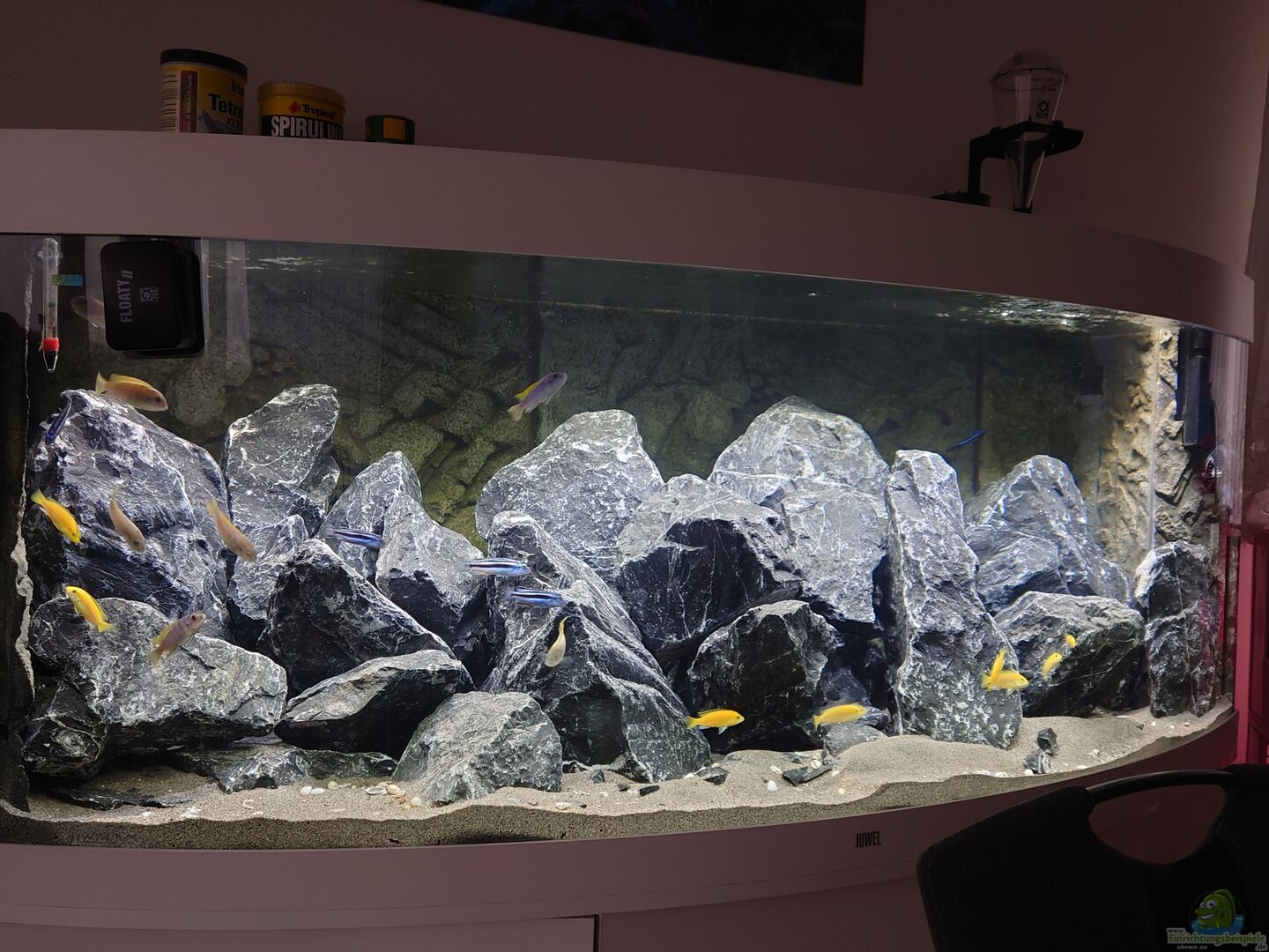 Wie üblich bei Vision Becken von Juwel eine gebogene Frontscheibe mit Sto??verklebung. Becken steht auf dem originalen Unterschrank von Juwel Unterschrank mit drei Türen, jede mit Push to Open Funktion. Dezente blaue indirekte LED Beleuchtung unter dem Schrank angebracht