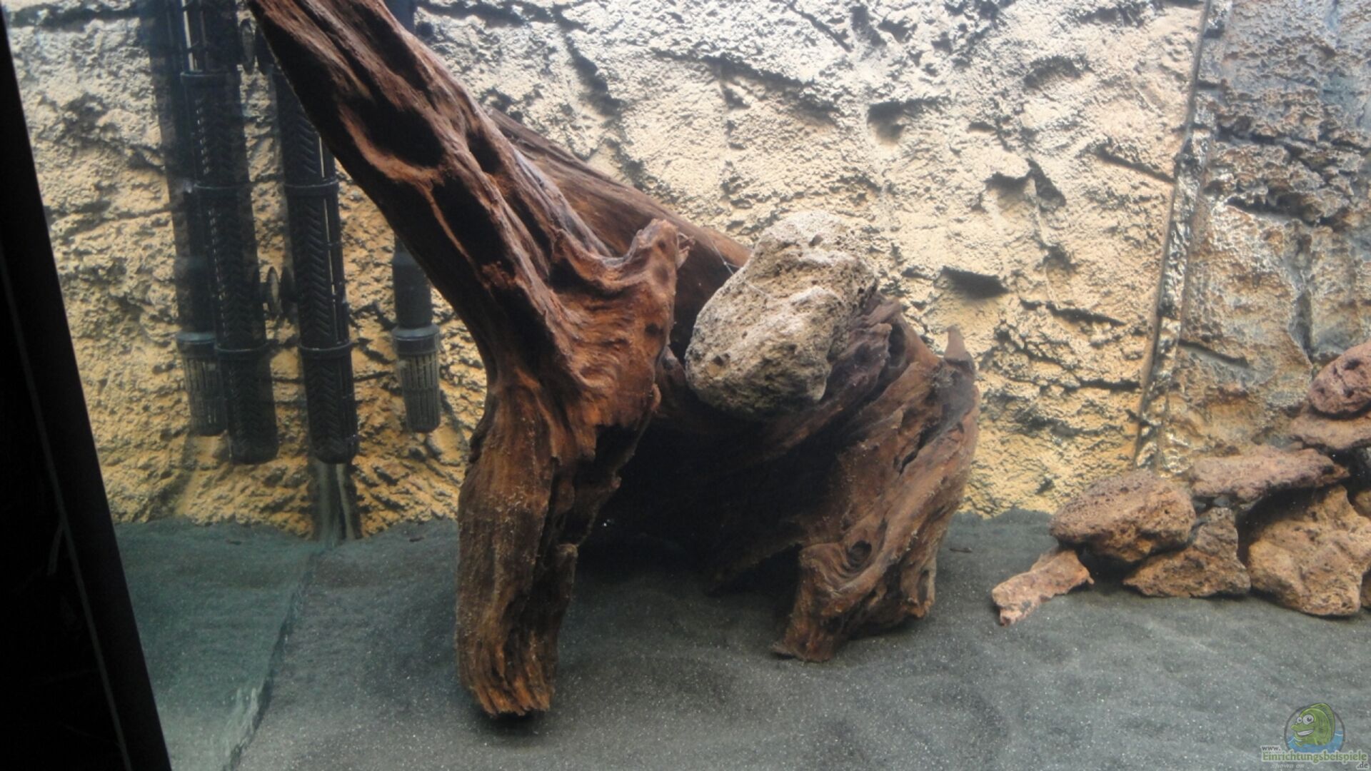 Eine gro??e Mangrovenwurzel, eine kleinere Morkienwurzel, selbstgebaute Höhle aus Lavasteinen. 3D Rückwand von Steinzeitdesign, Ausführung Slim, 2 Module à 60x60cm. Die Mittelnaht, an der die beiden Module zusammenstossen, habe ich mit Reststücken beklebt. Habe noch diverse Schieferplatten, normale selbstgesammelte Flu??kiesel und kleine Stücke Moorkienholz, mit denen ich noch das eine oder andere Versteck schaffen möchte