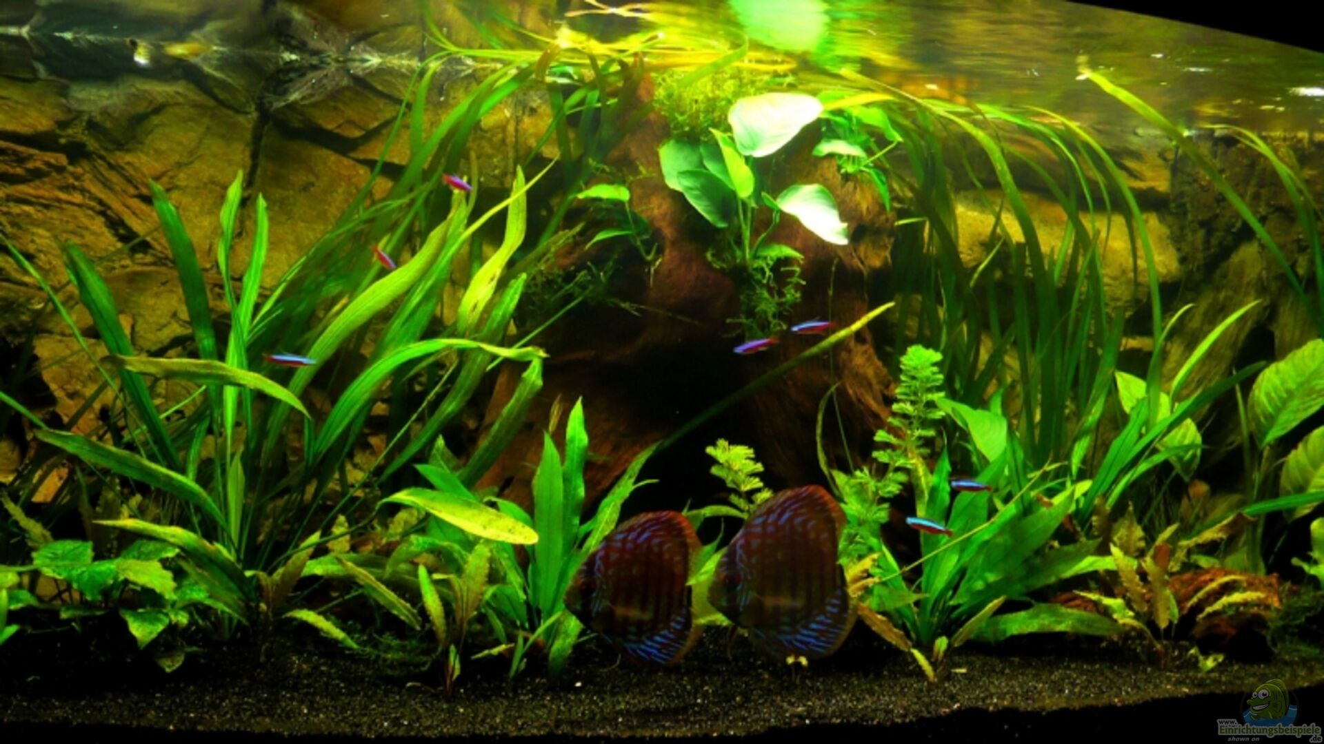 gro??e Mangrovenwurzel (wurde über 3 Monate gewässert) mit riesiger Höhle und Unterständen für die Diskus (60 x 50 x 20) und Bepflanzung mit Javamoos und Anubien, mehrere kleine Wurzeln, weitere kleine Höhlen befinden sich in der 3D-Rückwand, 3 Mooskugeln, im Becken sind strömungsreiche als auch Zonen mit ruhigem Wasser