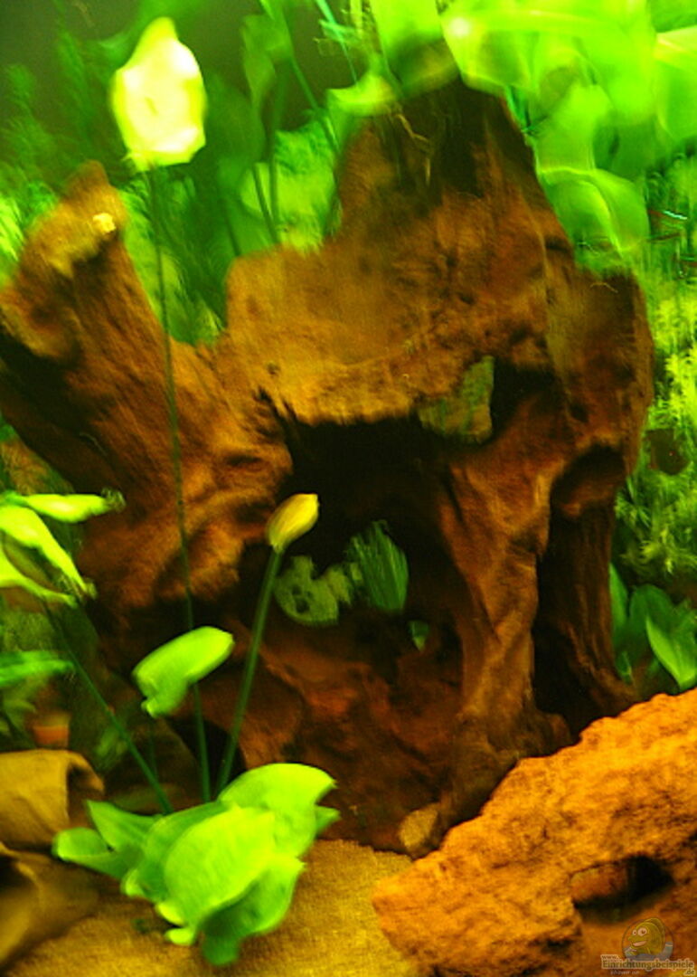 1 grosse Mangrovenwurzel 1 Savannenholzwurzel 1 selbstgebaute Höhle aus rotem Schiefer 1 Mehrfach-Tonhöhle 1 Lava-Lochstein mit Anubia bepflanzt