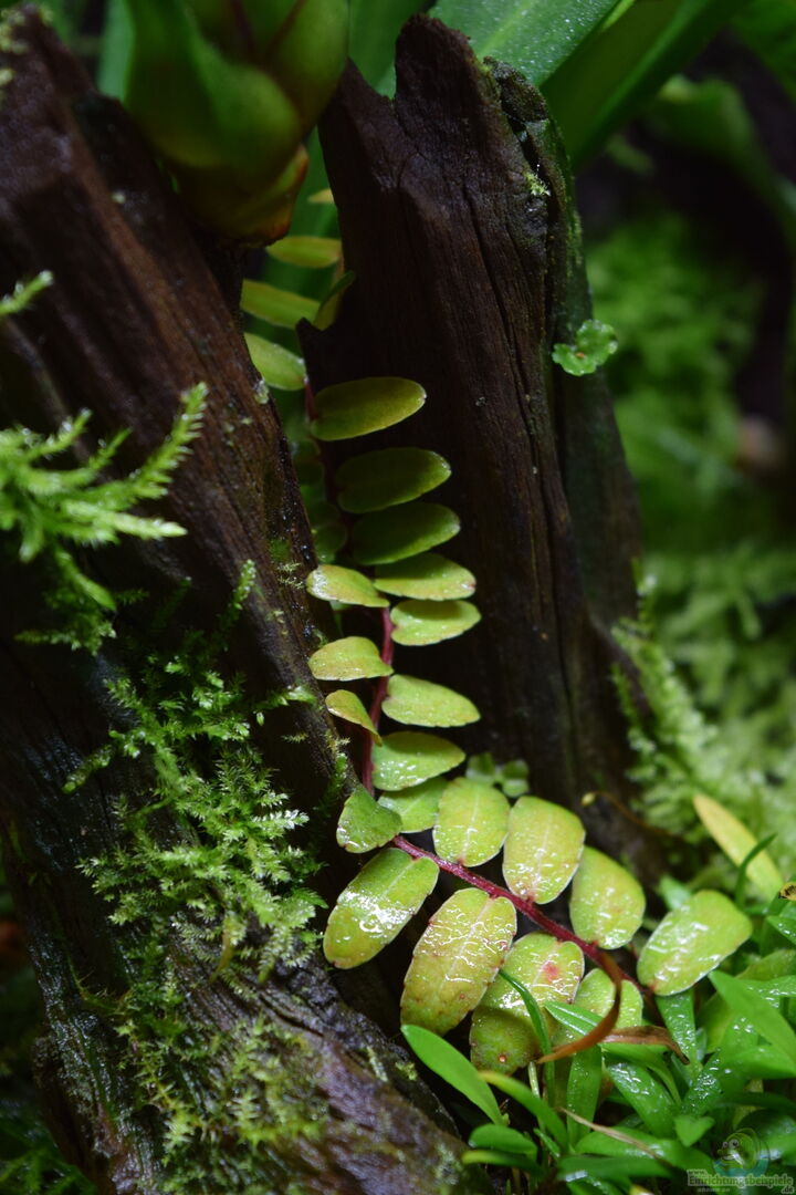 Tillandsien: Tillandsia bulboasa Ranken: Marcgravia umbellata, Begonia schulzii, Ficus spec. Borneo, Ficus quercifolia Bromelien: Neoregelia Alley Cat x pauciflora, Neoreglia Akeso, Cryptanthus microglazoui, Farne und Bodendecker: Taxiphyllum Spiky, Chirita tamiana, Hydrocotyle tripartia Mini Orchideen: Stelis ssp., Pleurothalis sonderana,