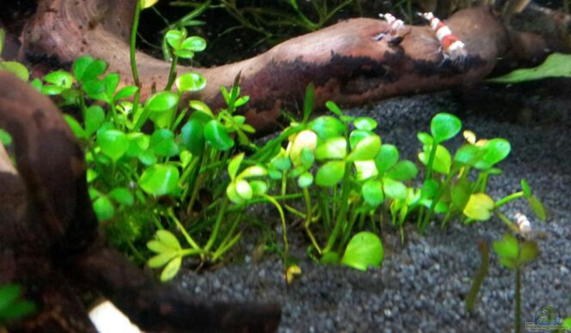 Ludwigia repens im Hintergrund, Cryptocoryne wendtii in Hinterund und Seitenbepflanzung. Microsorum pteropus auf Moorkienwurzel aufgebunden; Weeping Moos auf Moorkienwurzel aufgebunden; Im Vordergrund Marsilea hirsuta und im Mittelgrund Ammania bonsai (noch sehr klein)