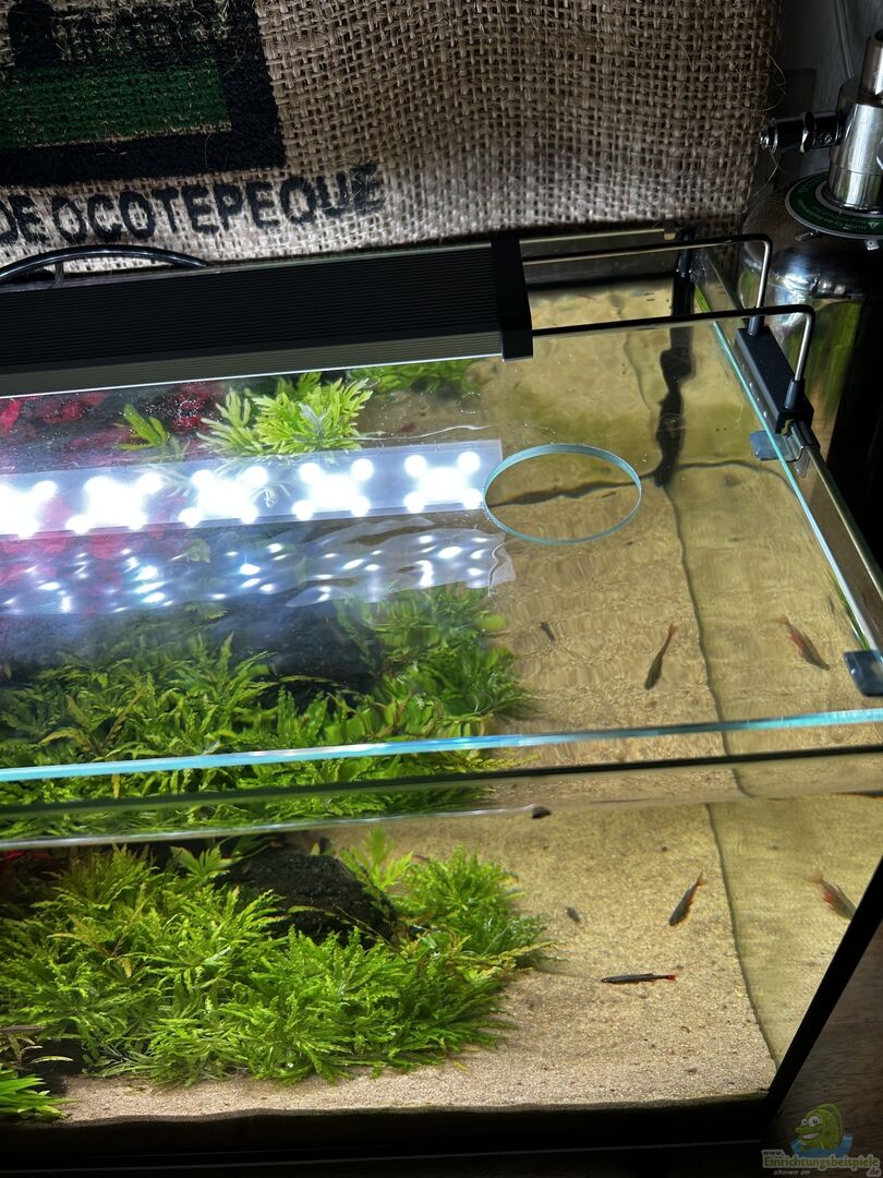 2/3 des Aquarium sind mit einer maßgefertigten Glasabdeckung bedeckt. Einerseits wollte ich ein offenes Becken, andererseits für die Welse ein zu starkes Abkühlen der Luft verhindern da sie ja Darmatmer sind und sich erkälten können.