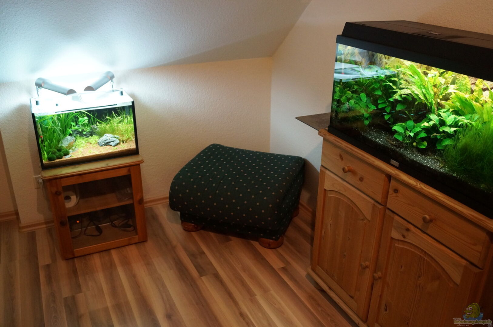 -Standard Glasbecken mit schwarzen Silikonnähten und Auflagen für Abdeckscheiben. -Die geteilte Abdeckung ist eine Eigenanfertigung aus Plexiglas -Schwarze Rückwandfolie