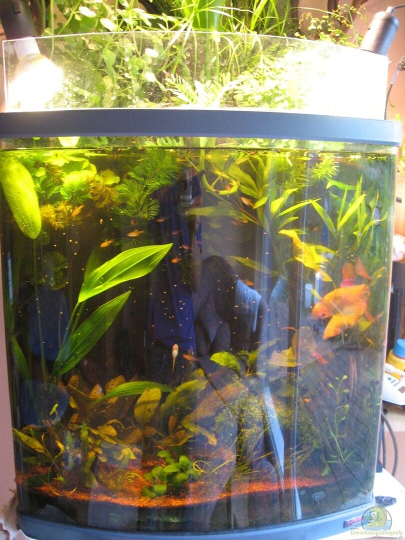 Offenes Aquarium mit viel Bepflanzung oberhalb des Wasserspiegels. Die vier Filterkästen hinter dem vorderen Aquarienbereich sind nicht mit Wasser gefüllt sondern werden als Pflanzkästen genutzt. Au??erdem befindet sich rechts vom Aquarium ein weiterer Pflanztopf mit Bepflanzung. Als Aufbau befinden sich über dem Aquarium Weidenäste, welche mit Flechten und Orchideen bepflanzt sind.