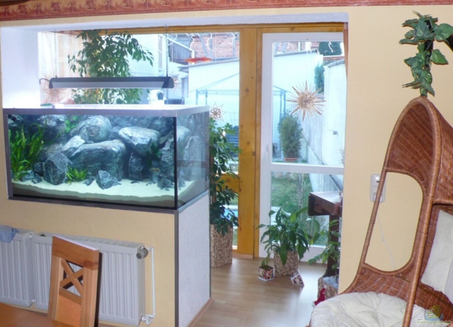 selbstgebaute Rückwand und Steine aus Zement, sie sind von hinten hohl damit nicht so viel schwimmraum weggenommen wird, ca.:90kg sowie ca.:60kg italienischer Basaltbruch(Nero Imperial) im becken liegt eine Plexiglasplatte, die einzelnen Steine stehen zusätzlich auf Styrodur