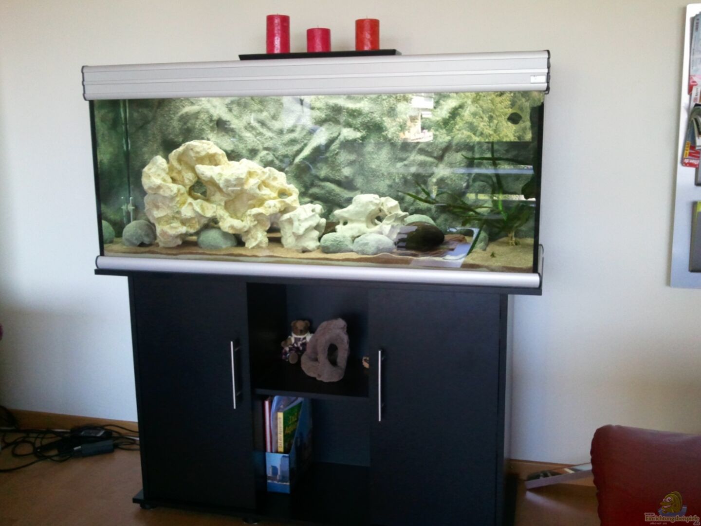 Selbstgemachte Rückwand aus Styropor, Aquariumsilikon und Cement. Zum Schluss habe ich diese noch mit Sand bestreut. Die kleinen runden Steine habe ich innen hohl mit einem Eingang gemacht, damit sich die Fische verstecken können. Die Steine habe ich folgendermassen gemacht: Papierkneuel immer wieder im Cement tauchen. Bei gewünschter Dicke, den Stein samt Papier im Wasser einweichen lassen. Das Papier kommt dann leicht raus. Das Cement habe ich nach jeder Schicht trocknen lassen um Risse [...]
