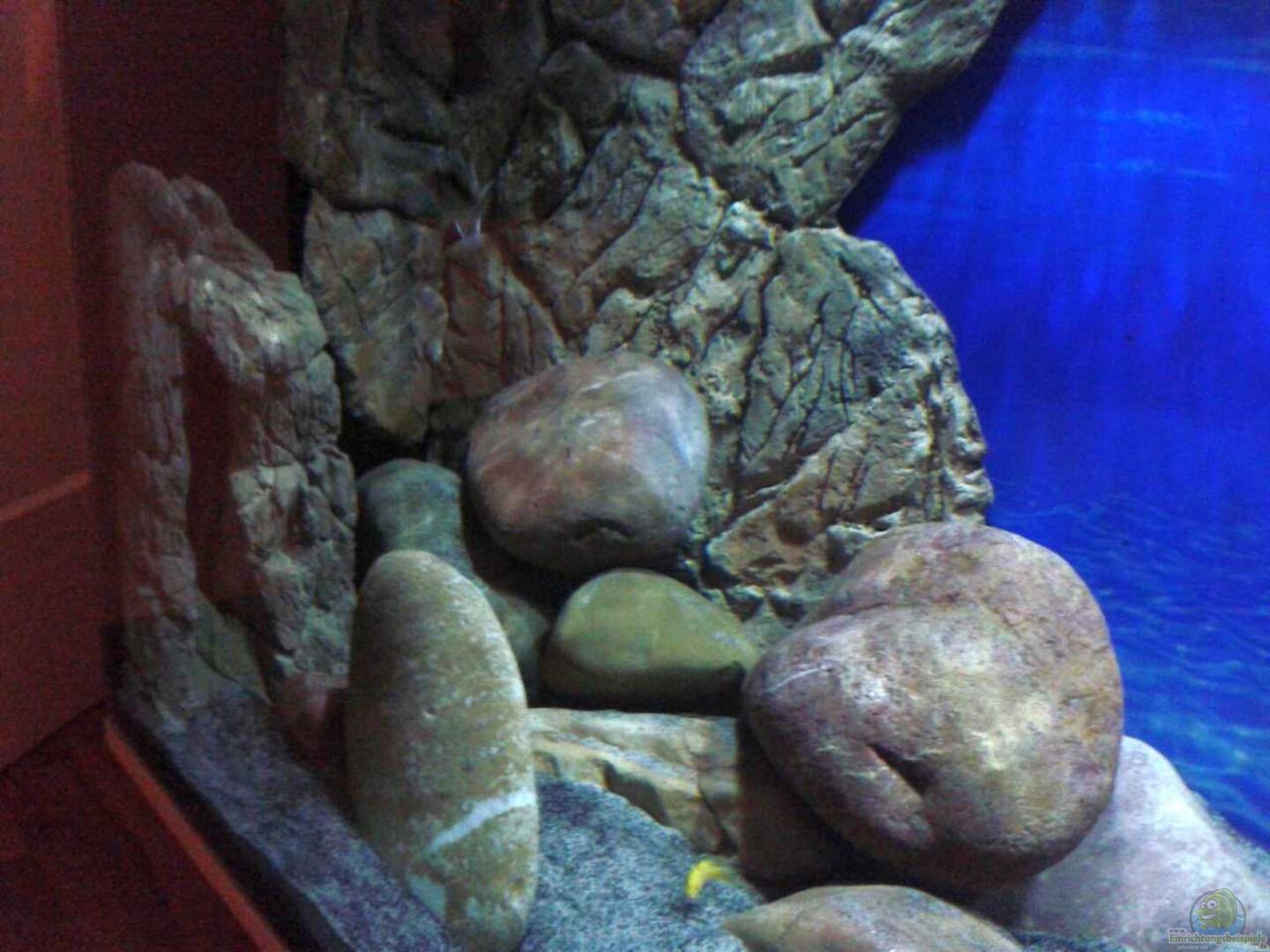Steine, Steine, Steine, diese sowohl echt wie künstlich aus GfK 3D-Rückwände, Slim-Line NoName, in Form geflext und geschliffen schwarze Rückwandfolie Minimuschelmix im Bodengrund sowie lose aufgeschüttet