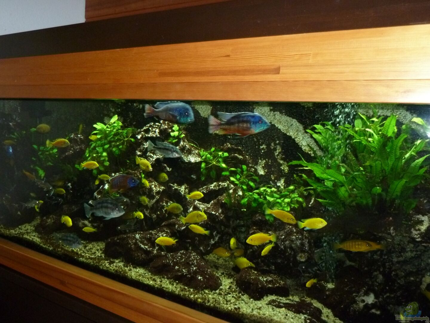 Okt. 2004 Eigenbau/Holzbecken: 22 mm starke Tischler-Stäbchenplatten, innen mit 6 mm starken Glas belegt und mit Silicon verklebt. Durch den Wasserdruck werden die Glasscheiben innen satt an die Holzplatten gedrückt. Die Frontscheibe ist 15 mm stark. Das Becken steht auf zwei Doppel-T-Trägern, welche von Wand zu Wand eingemauert sind. Gewichtsprobleme gibt es hier nicht.