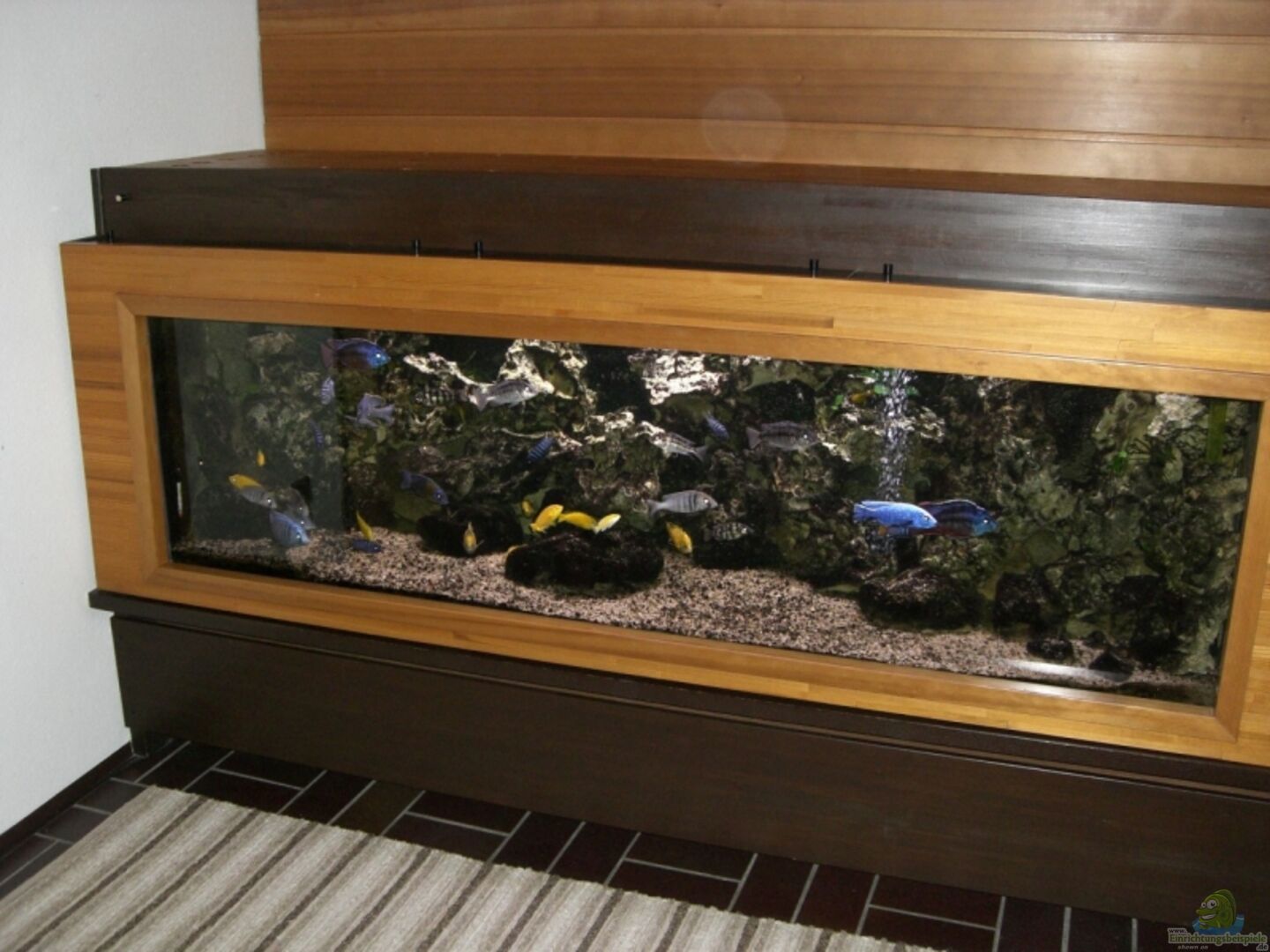 Okt. 2004 Eigenbau/Holzbecken: 22 mm starke Tischler-Stäbchenplatten, innen mit 6 mm starken Glas belegt und mit Silicon verklebt. Durch den Wasserdruck werden die Glasscheiben innen satt an die Holzplatten gedrückt. Die Frontscheibe ist 15 mm stark. Das Becken steht auf zwei Doppel-T-Trägern, welche von Wand zu Wand eingemauert sind. Gewichtsprobleme gibt es hier nicht.