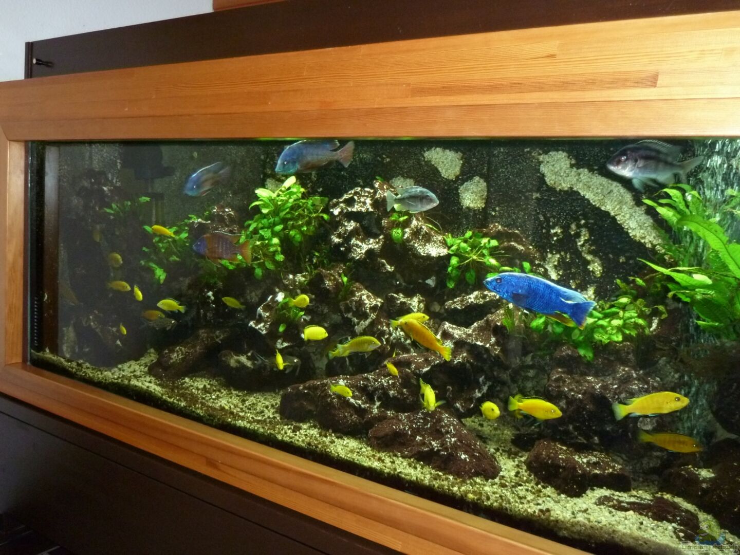 Okt. 2004 Eigenbau/Holzbecken: 22 mm starke Tischler-Stäbchenplatten, innen mit 6 mm starken Glas belegt und mit Silicon verklebt. Durch den Wasserdruck werden die Glasscheiben innen satt an die Holzplatten gedrückt. Die Frontscheibe ist 15 mm stark. Das Becken steht auf zwei Doppel-T-Trägern, welche von Wand zu Wand eingemauert sind. Gewichtsprobleme gibt es hier nicht.
