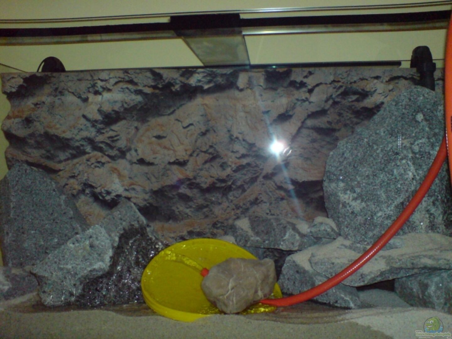 -Sonderanfertigung 120*50*60 Aquarium mit 10 mm Glas mit einer Querstrebe. -Selbstgebauter Unterbau -Rückwand ist von Steinzeitdesign aus ??sterreich