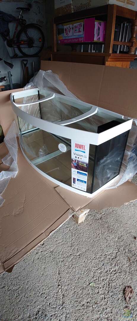 Wie üblich bei Vision Becken von Juwel eine gebogene Frontscheibe mit Sto??verklebung. Becken steht auf dem originalen Unterschrank von Juwel