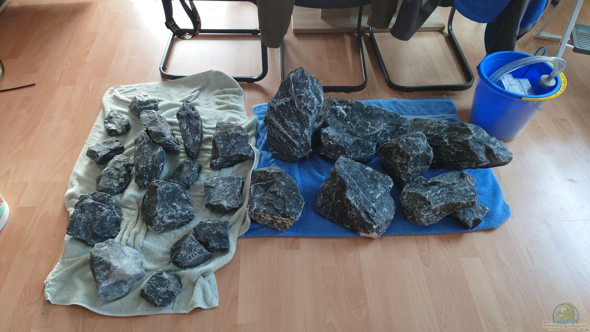 Geschätzt ca. 200 Kg Alpenkalkstein in verschiedenen Grö??en auf einer 4mm Plexiglas Scheibe. Die grö??eren Steine haben dabei locker 30 Kg auf die Waage gebracht. Rückwand und die linke Seitenscheibe sind mit Stone Granite Rückwandmodulen von Juwel verkleidet. Der Innenfilter wurde ebenfalls mit Stone Granite Modulen von der Firma Juwel verkleidet.