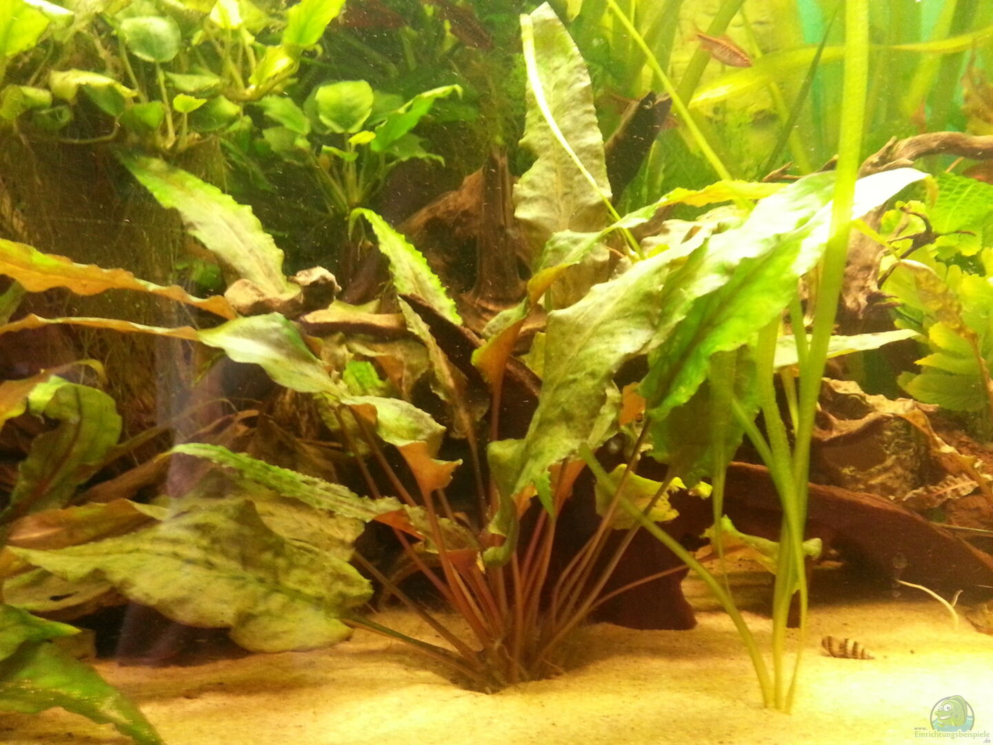 Hindergrund: - Brasilianischer Wassernabel, Hydrocotyle leucocephala - Boivins Wasserähre, Aponogeton boivinianus - Anubias nana(findet sich ??berall im Aquarium wieder) - Gro??e Cognacpflanze, Ammannia gracilis - Rote Sumpf-Ludwigie, Ludwigia palustris Rot - Riesenvallisnerie, Vallisneria gigantea (Die einzige Pflanze die trotz fehlender Düngung gewachsen ist) Mittelgrund/Vordergrund: - Brauner Wasserkelch, Cryptocoryne wendtii braun - Breitblättriger Javafarn, Microsorium [...]