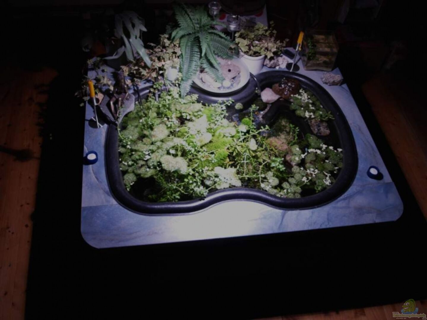 Fertigteich für den Garten, in Holzrahmen eingeschäumt. Steht im Wohn-/Arbeitszimmer. Gesamtgrö??e: 140 x 120 x 46 cm Der Teich ist mit einer ´Ablage´ aus einer Küchenarbeitsplatte umgeben.
