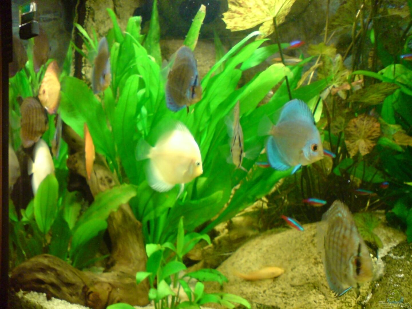 Fische: 8x Diskusfische (Symphysodon aequifasciata), (2x Pigeon Blood, 2x White Diamond, 1x Kobaltblau, 1x Brillanttürkis und 2x Braune (Alenquer (S. aequifasciata axelrodi)) Grö??e: >15 cm Geschlechtsunterschied: sehr schwer zu erkennen Futter: Lebend-, Gefrier- und Granulatfutter (sehr abwechslungsreich fuettern, sonst drohen Krankheiten) Aquarium: min. 120 cm (ca. 240 - 300 l) Beckenbereich: mitte Sozialverhalten: Gruppenhaltung (ab 5 Tiere) Herkunft: Amazonien [...]