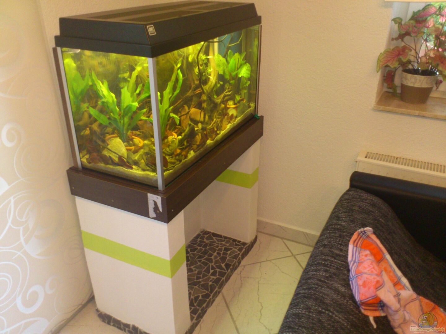 Das Aquarium ist ein normales rechteck Becken, mit angeklebten Alu-Leisten zur Stabilisierung, da mir einmal eine Verklebung aufgegangen ist. Wohlmöglich ist diese zusätzliche Stabilität nur Einbildung. Hinter dem Aquarium sind dunkel bemalte Styroporplatten, ist einfach, billig und nimmt kein Platz in Anspruch. Grüne Campingmatte als Unterlage die mal braun bemalt wurde. Leider hat den beiden Katzen die Bemalung nicht gefallen, dass diese von den beiden kurzerhand entfernt wurde.