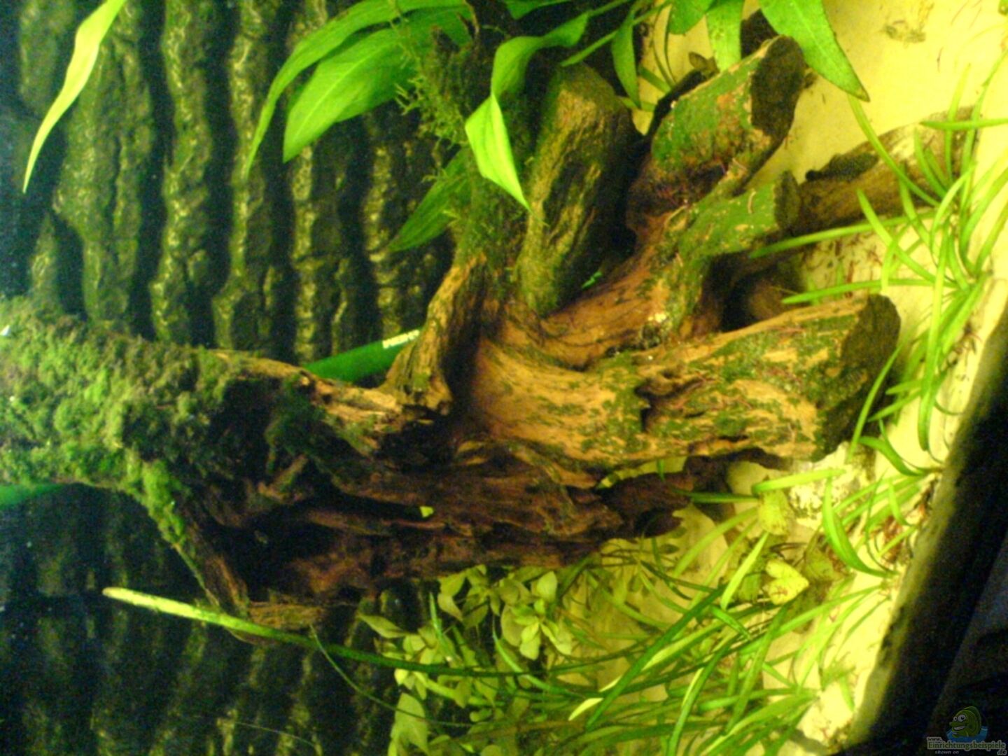 2 Mangrovenwurzeln, eine selbstgefangene Feldwaldwiesenwurzel mit Javamoos und anubias bepflanzt, die bereits seit anderthalb Jahren im alten Becken lag. 2 Kokosnusshälften als Höhlen sowie weitere Höhlen durch Wurzel und Steine.