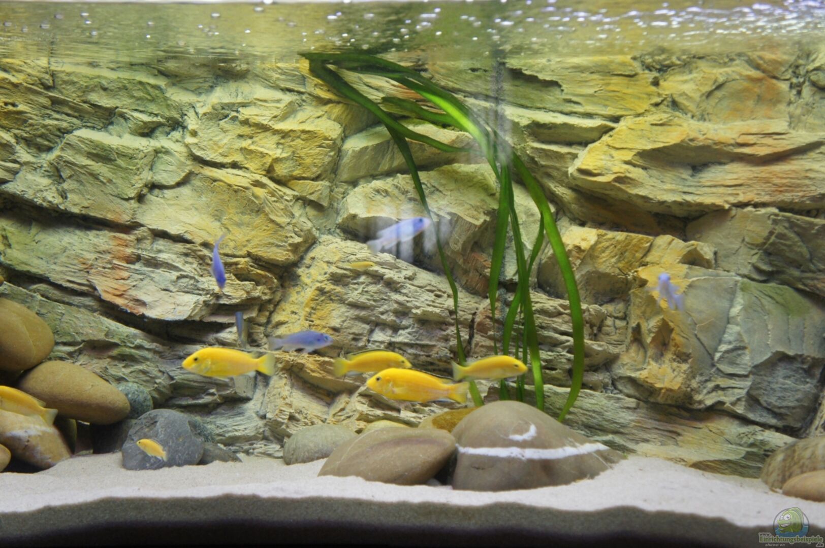 Bei der Einrichtung entschied ich mich für einerseits Steinaufbauten aus Sandstein und andererseits für Aufbauten aus Kieselsteinen. Hier kann jeder für sich entscheiden ob er es mag mir gefällt es vorerst gut und belebt mein Aquarium irgendwie. Der Kontrast zwischen den kantigen Sandsteinen und den runden Kieselsteinen wirkt besonders auf mich. Durch die verbaute 3-D Rückwand (2-teilig) wirken besonders die Sandsteine noch besser im Aquarium und sie vollendet mein Steinebecken.