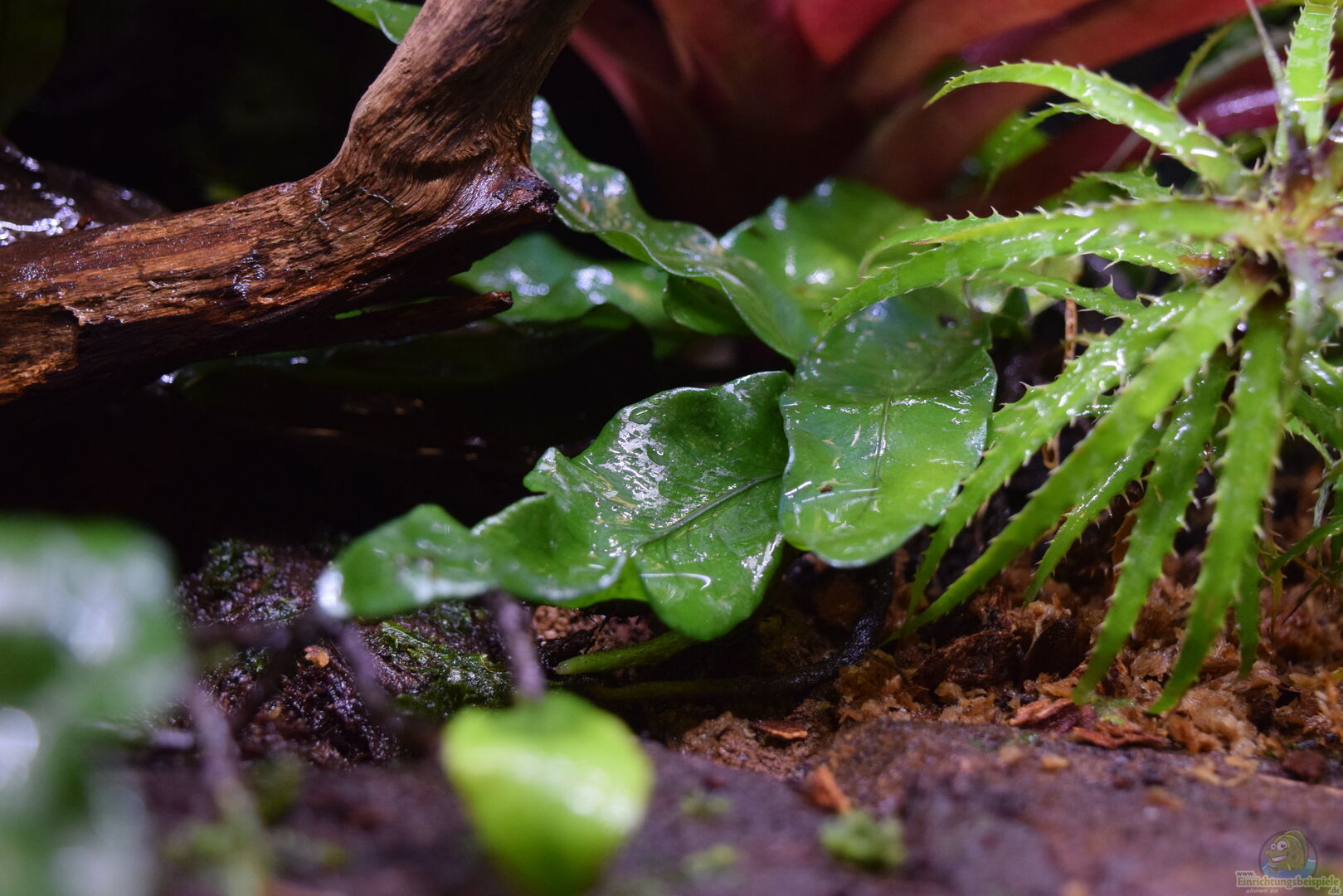 Ferns/Farne: Pyrrosia lanceolata, Selaginella unicata, Polypodium formosanum, Microgramma nitida Bromeliads/Bromelien: Neoregelia Hannibal, Neoregelia Fireball, Cryptanthus microglazioui Bodendecker/Ground plants: Bucephalandra spec. Green Velvet, Anubias bartei var. nana Mosses/Moose: Taxiphyllum barbieri, Leptodictyum riparium, Orchids/Orchideen: Barbosella cogniauxiana, Pleurothallis macroblepharis, Kletterer/Climbing plants: Ficus scandens, Epipremnum spec., Ficus punctata