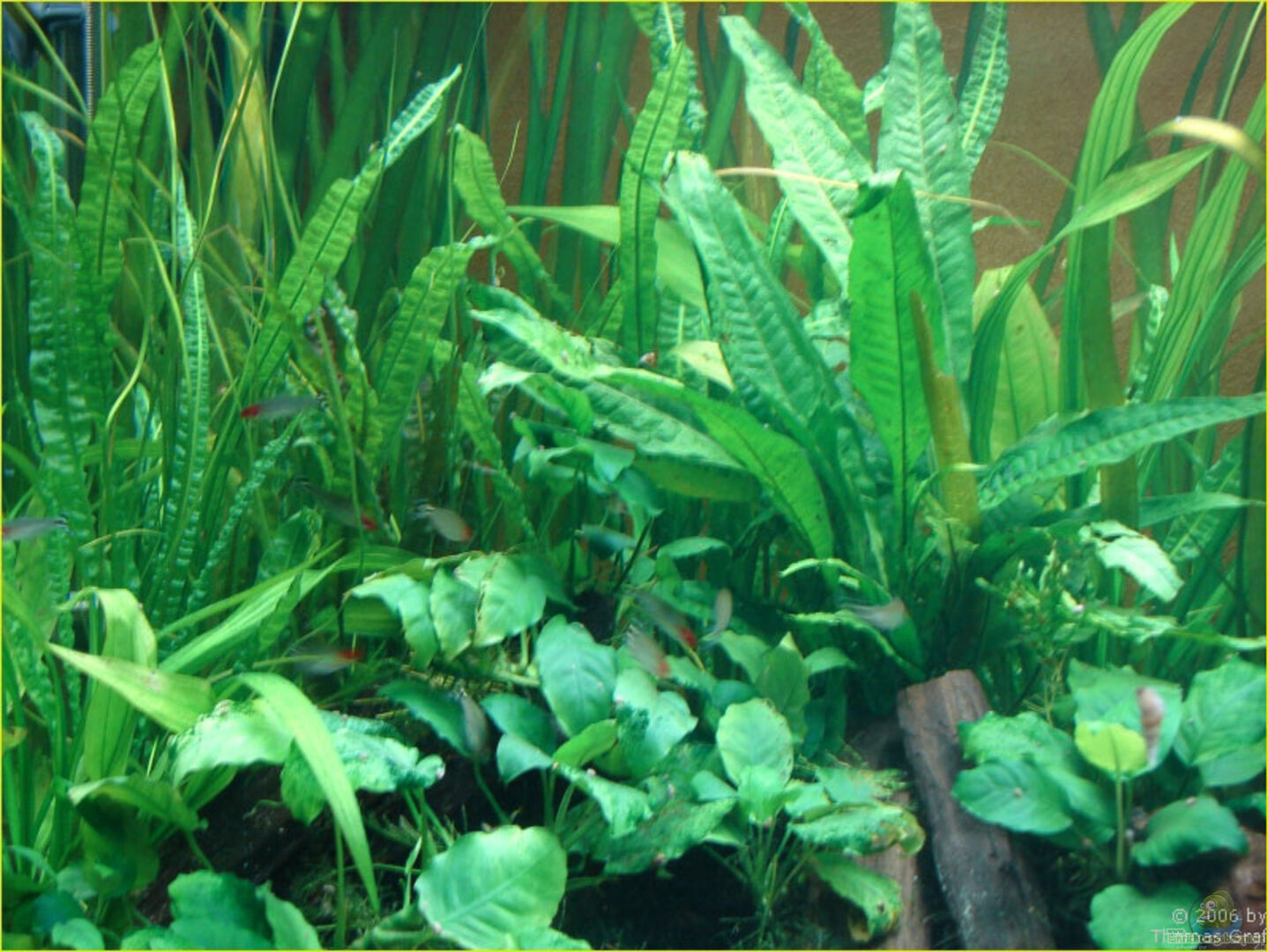 Das Becken ist in 4 Bereiche eingeteilt. Hintergrund, vorne rechts, mitte und links. Der Hintergrund ist mit hochwachsenden Pflanzen wie Echinodorus bleheri, Echinodorus decumbens sowie Cryptocoryne balansae und Cryptoyoryne crispatula besetzt. Einige Valisneria nana bilden auf der rechten hinteren Seite einen kleinen Dschungel der gerne von den Rotkopfsalmlern angenommen wird. Im vorderen rechten Teil bildet Eleocharis parvulus (Nadelsimse) einen Rasen. Der vodere linke Teil ist mit der ebenfalls [...]