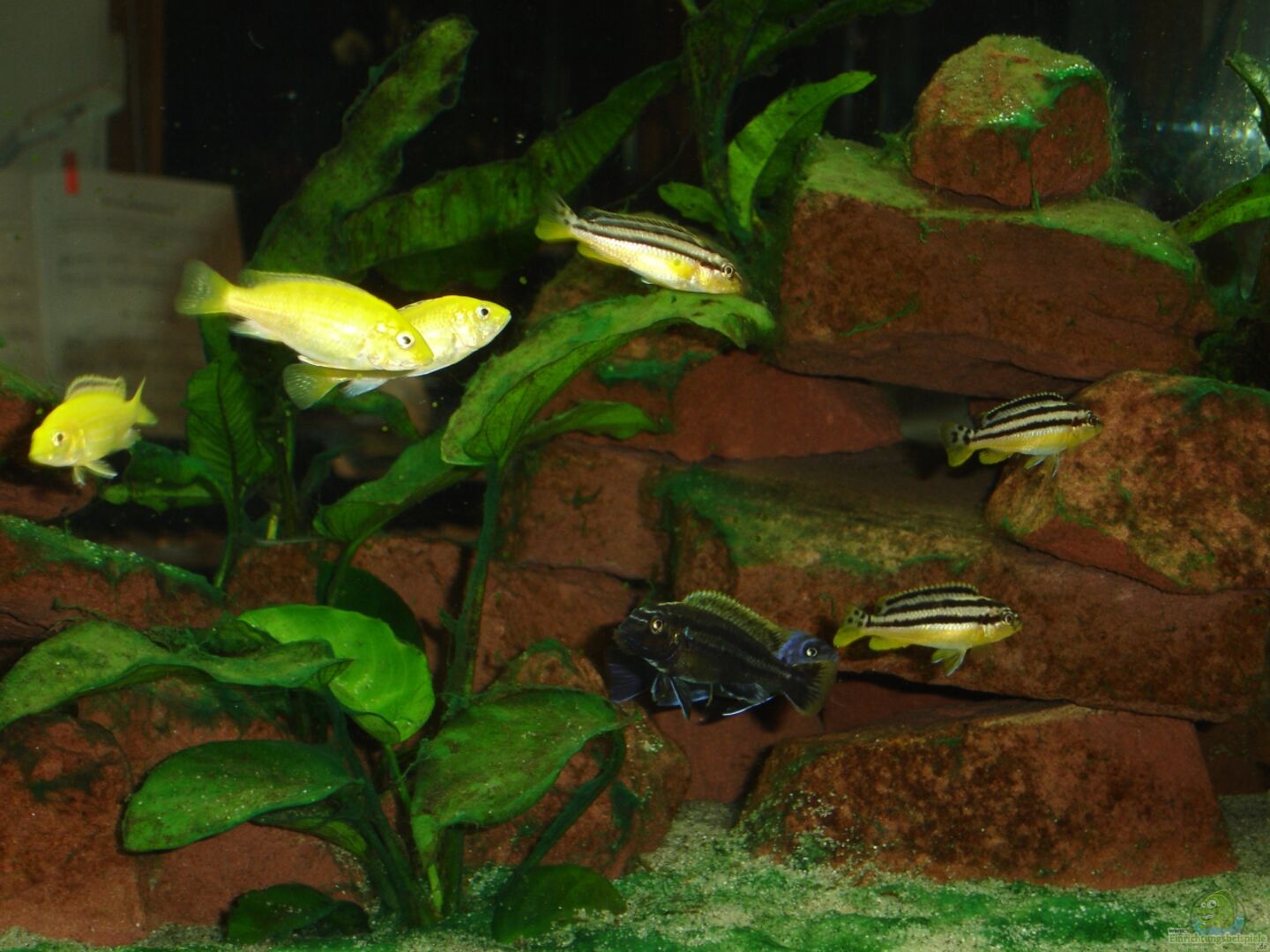 Inzwischen ist die Hackordnung mehr oder weniger ausgefochten. (Un)eingeschränkter Chef ist der Eureka, gefolgt vom Iceberg, dann ggfs. noch der Cynotilapia-Mann und der Yellow-Mann, die bekommen aber auch ab :-). Ansonsten jagt man und wird gejagt, wie es gerade passt. Aber alles im grünen (verletzungsfreien) Bereich. Man kann ausserdem sehr nett beobachten, wie insbesondere die kleineren immer wieder die Algenteppiche auf den Steinen abweiden. Labidochromis caeruleus "yellow" [...]