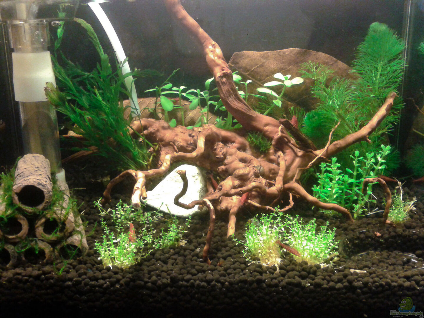 Zuchtbecken für Rote Taiwan Sakura Garnelen. Alle 3 Becken sind ein wenig im Aquascaping-Stil angelegt und sind durch den starken Pflanzenwuchs passend für die Bedürfnisse der Garnelen eingerichtet. Rückscheibe + eine Seitenscheibe sind für mehr Tiefenwirkung mit schwarzer Folie beklebt.